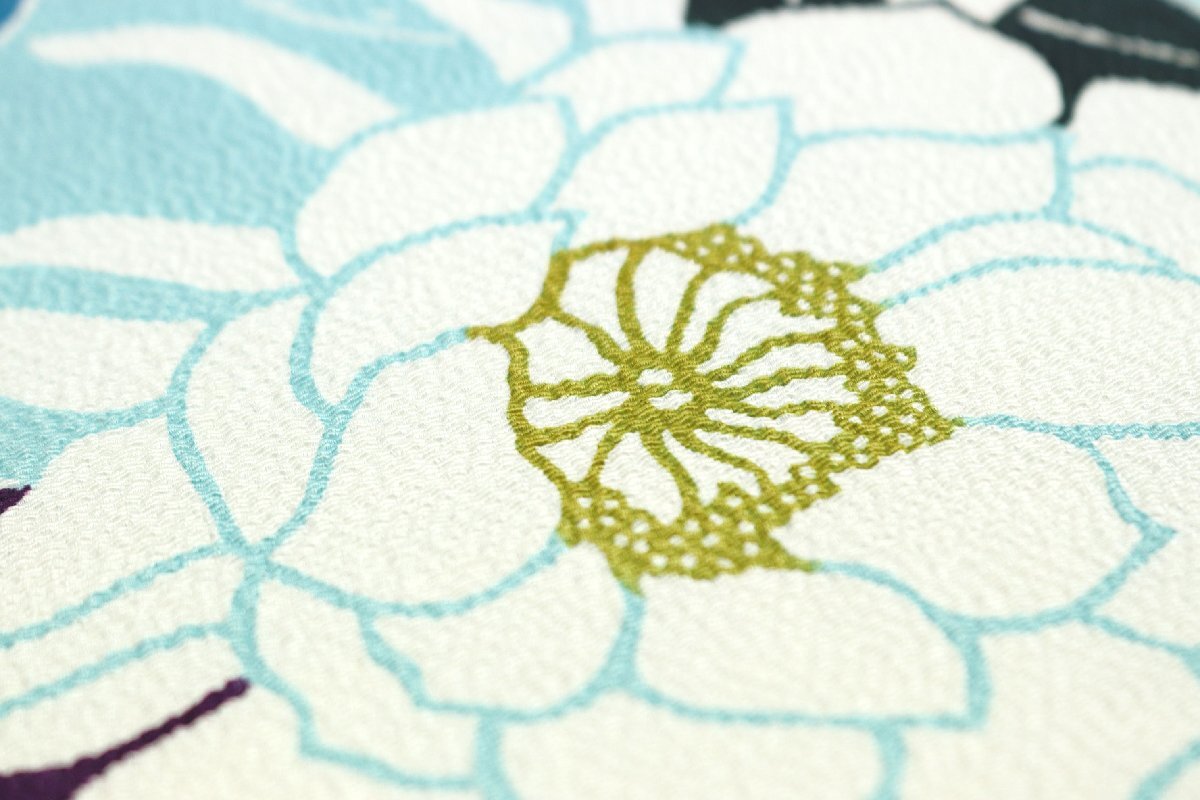 お太鼓と胴柄部分には、白色や深紫色、菜種油色、藍色、灰青色などのお色目が手挿しされており、モダンな印象でございます。