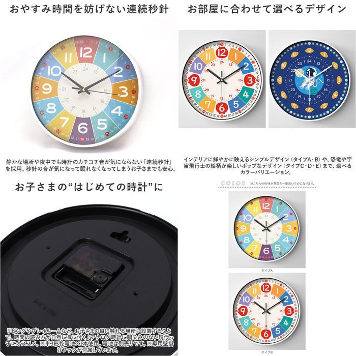 | 商品説明 | ・・大きく見やすい文字盤で、時計の読み方を楽しくお勉強!壁に掛けて、自然に時間が学べる「子ども 知育掛け時計」が新登場。 ・【時間が見やすいカラフル仕様】 ・ラウンド型の大きめの文字盤に、カラフルなインデックス数字をくっきり見やすく並べた、時間の感覚を直観的に学習できる知育時計。 ・【時間と分の読み分けもサポート】 ・文字盤外側の目盛り部分には、小さな文字で分数・60秒スケールを配置。時間学習をする上でつまづきやすい「時間と分」の読み分けも優しくサポート。 ・【実生活で役立つ24時間スケール】 ・インデックス数字内側に「24時間スケール」を表示することで、より実生活に役立つ時間の読み方もしっかりマスター! ・【設置が簡単、掛け時計タイプ】 ・壁掛けフックにちょこんと引っ掛けるだけで、ママさんでも設置が簡単(※1)。お子さまの目線の位置に取り付けるのがポイント! ・【おやすみ時間を妨げない連続秒針】 ・静かな場所や夜中でも時計のカチコチ音が気にならない「連続秒針」を採用。秒針の音が気になって眠れなくなってしまうお子さまでも安心。 ・【お部屋に合わせて選べるデザイン】 ・インテリアに鮮やかに映えるシンプルデザイン(タイプA・B)や、恐竜や宇宙飛行士の絵柄が楽しいポップなデザイン(タイプC・D・E)まで、選べるカラーバリエーション。 ・【お子さまの“はじめての時計”に】 ・リビングやプレイルームなど、お子さまの目に触れる場所に設置することで、時間の読み方が自然に身に付く♪アナログ時計に馴染みのない現代っ子にオススメ。 ・※単3形乾電池×1本使用。電池は別売りです。 ・※専用壁掛けフックが付属しています。 |