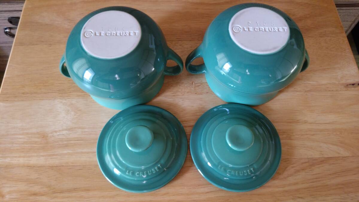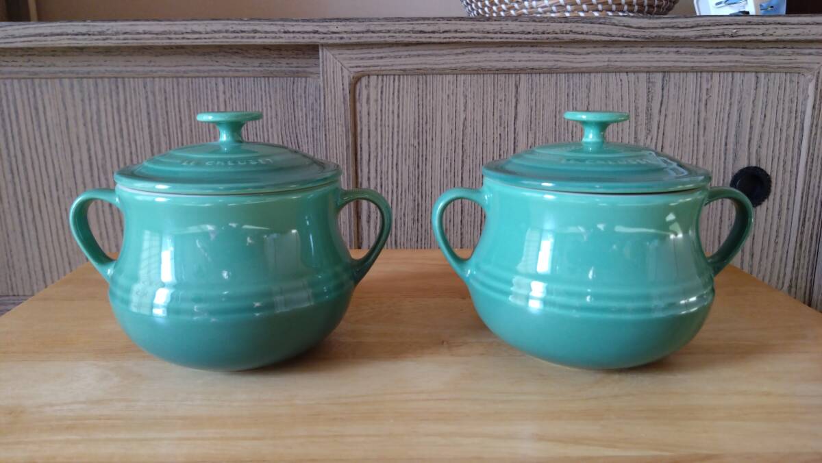 ル・クルーゼの蓋つきスープポット2個セット(箱無し)です。直径 約8㎝ * 横約12㎝ * 高さ9㎝容量 約500ml特徴 両手ハンドル付き数量 2個セット