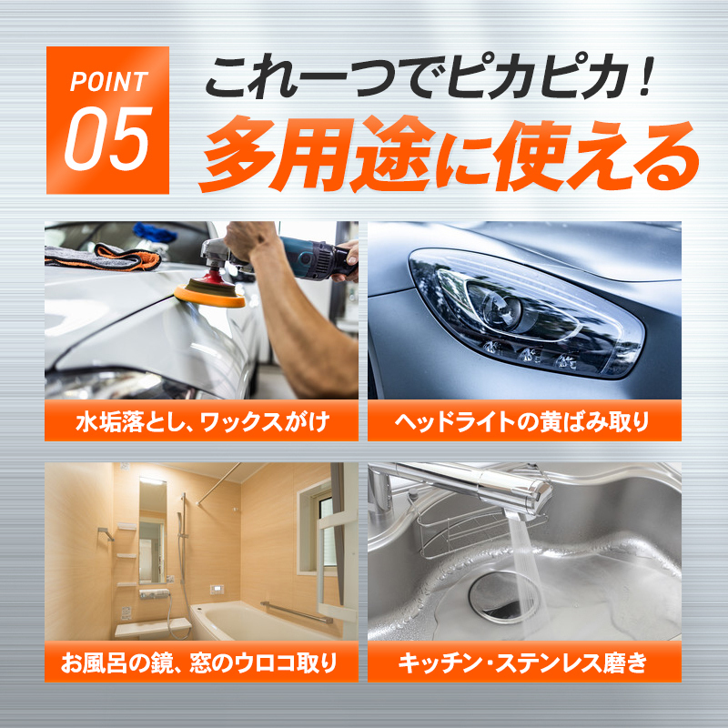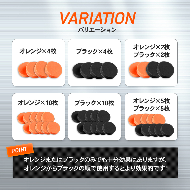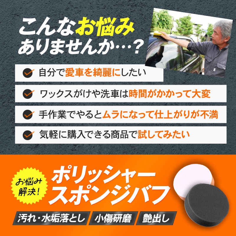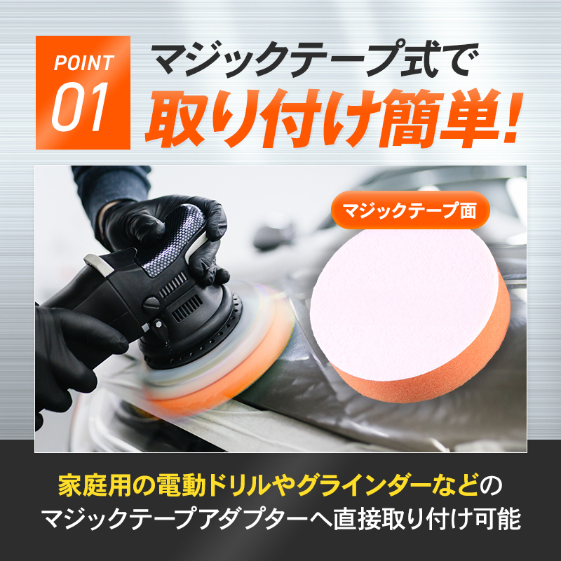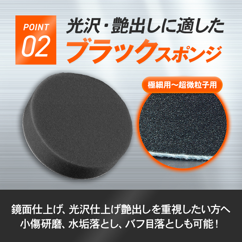 【商品内容】 ポリッシャースポンジバフ125mm/ ブラック2枚&オレンジ2枚/説明書付き 【ブラックスポンジ特徴】 極細用〜超微粒子用として光沢・艶出しに適したスポンジです。 【ブラックスポンジはこのような方へ】 鏡面仕上げ、光沢仕上げ艶出しを重視したい方へ 小傷研磨、水垢落とし、バフ目落としもにも最適です! 【オレンジスポンジ特徴】 中目用〜細目用として小傷や・水垢落としに適したブラックスポンジです。 【オレンジスポンジはこのような方へ】 ブラックより研磨力やや強く研磨力が欲しい方へ 小傷研磨、水垢落とし、バフ目落としもにも最適です! 【スポンジバフ特徴】 ◎マジックテープ式で取り付け簡単〜 家庭用電動ドリルやグラインダーなどのマジックテープアダプターへ直接取り付け可能! ◎水洗いできるから繰り返し使えて経済的〜 しっかり揉み洗いした後は乾燥させるだけ!簡単なお手入れで何度もご使用可能! ◎多用途に使える〜 水垢落とし、ワックスがけ、ヘッドライトの黄ばみ除去、お風呂の鏡、窓のウロコ取り、キッチン・ステンレス磨きもこれ一つでピカピカに! 【保管に便利】 長期保管で埃が付着すると性能劣化につながりますが保管に便利なジッパー付き袋でお届けしますので衛生的です。 【発送】 平日+土曜日は毎日発送を行います。 ご購入後2日以内に出荷予定! 4枚入り(おてがる配送) 10枚入り(佐川急便) 【バリエーション】 オレンジ4枚 ブラック4枚 オレンジ2枚&ブラック2枚→現在の選択商品はこちらですオレンジ10枚 ブラック10枚 オレンジ5枚&ブラック5枚