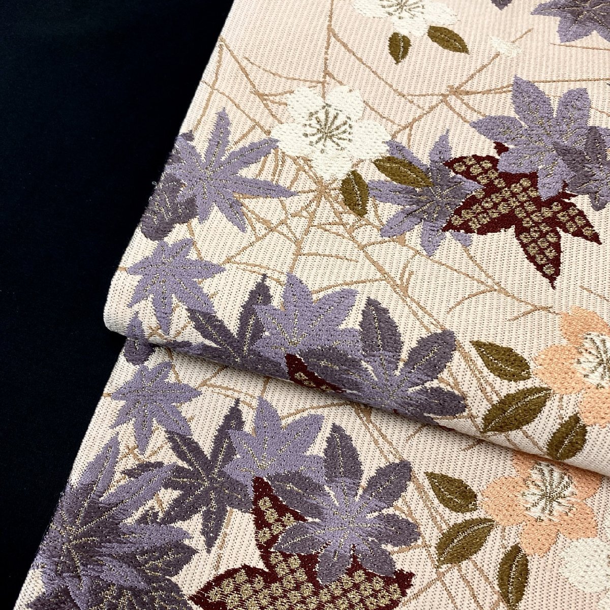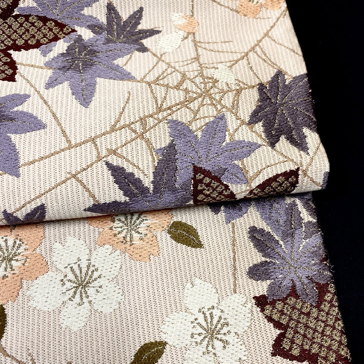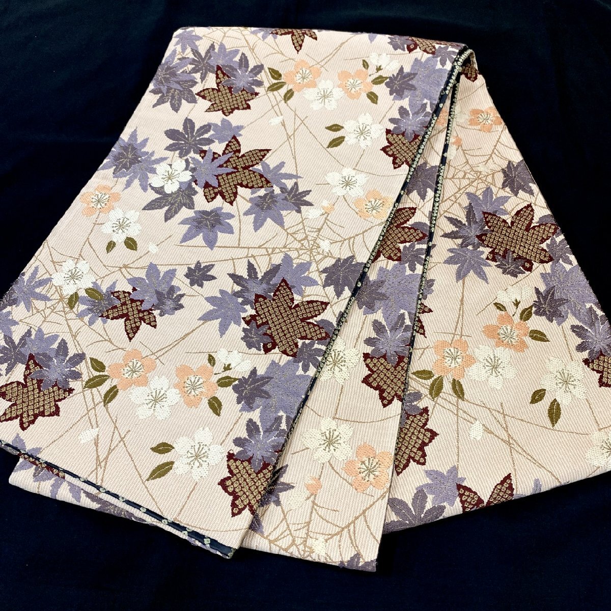 小花に蜘蛛の巣が描かれた袋帯でございます。
