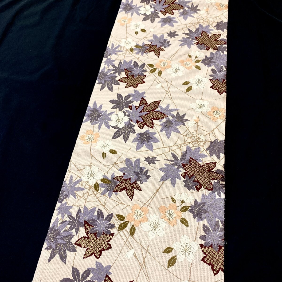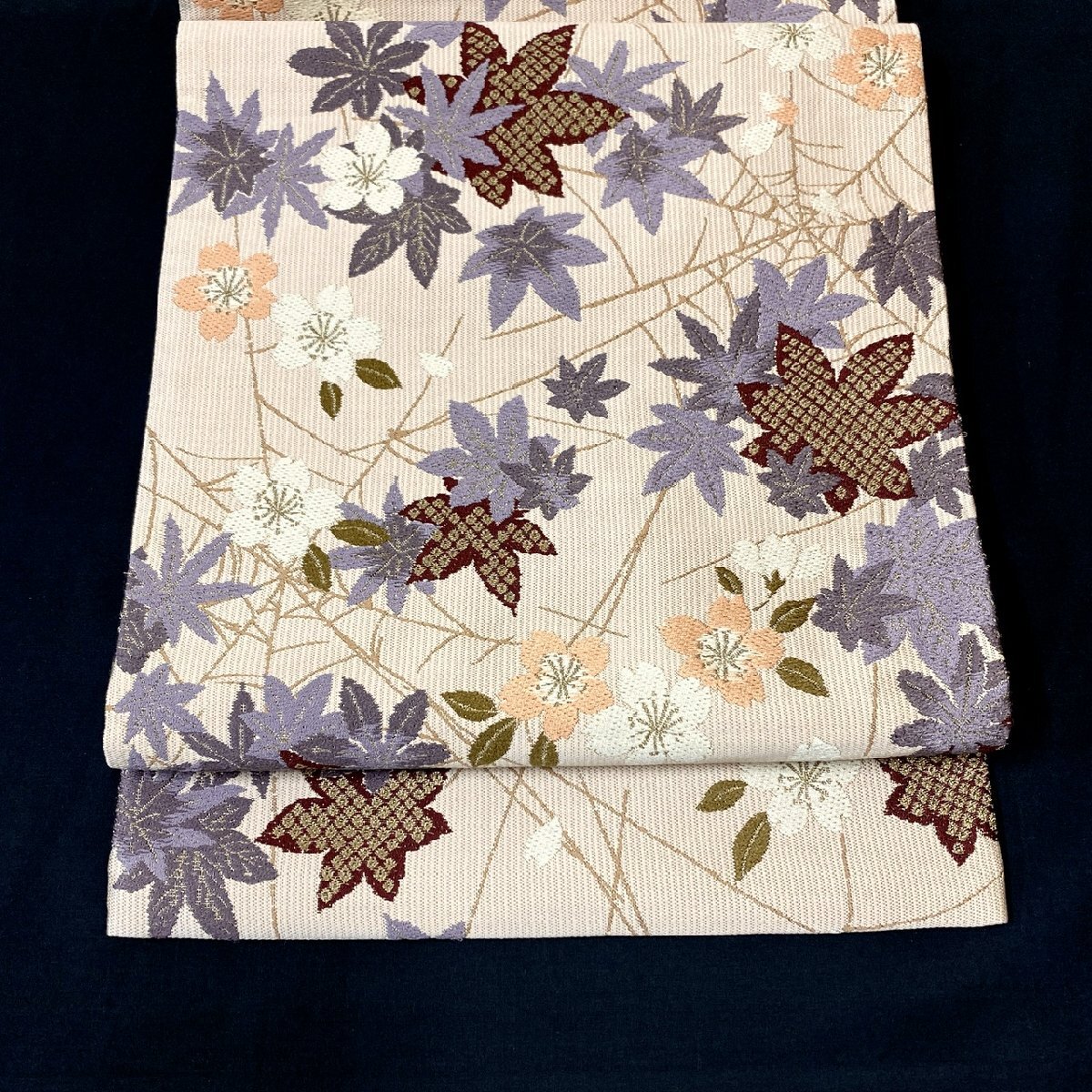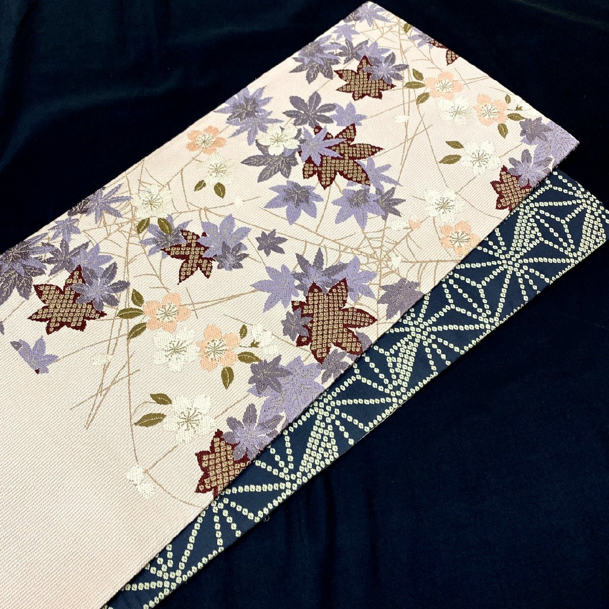 小花に蜘蛛の巣が描かれた袋帯でございます。