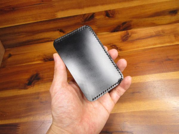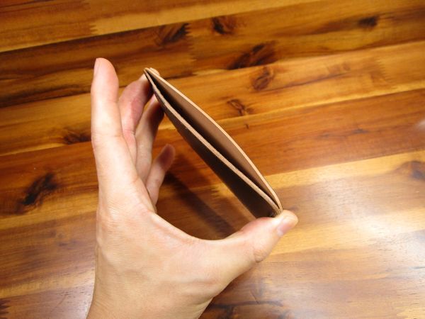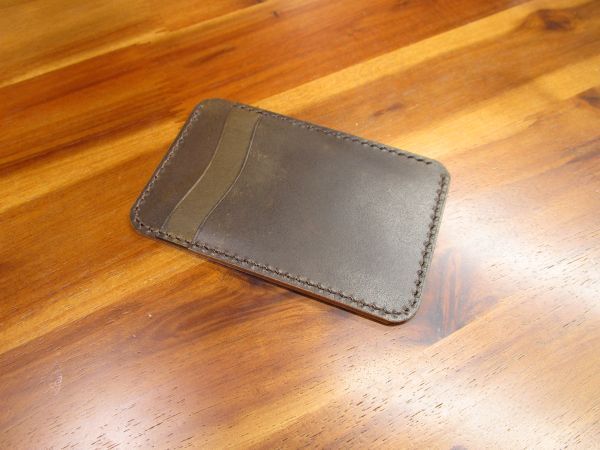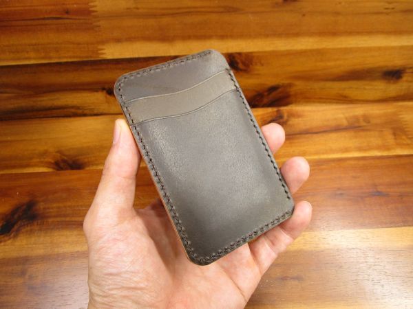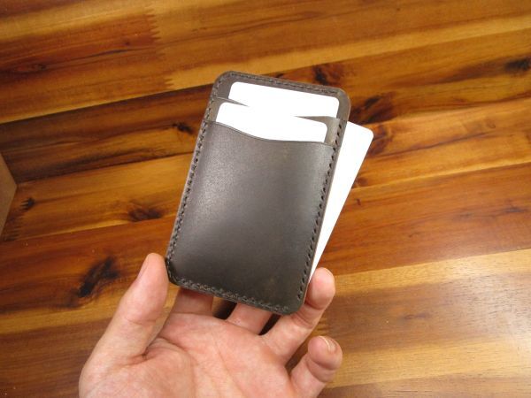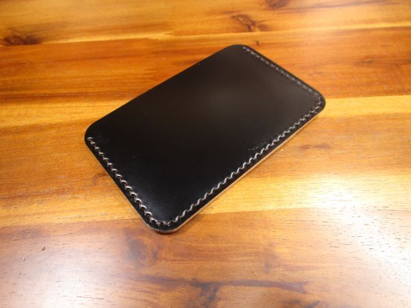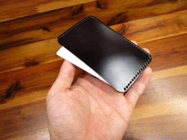 シンプルで高品質なカードケースです。 表にカードポケットが2つ、内側にカードポケットがもう1つのシンプルな構造です。 片手に収まるコンパクトなサイズで、厚さが4mm程度と薄型でおさまりがよいです。 内側ポケットには複数枚のカードが収納可能です。 最高級皮革、新喜皮革製コードバンを使用。 切り出しから、仕上げまで、すべて手作業で製作しました。