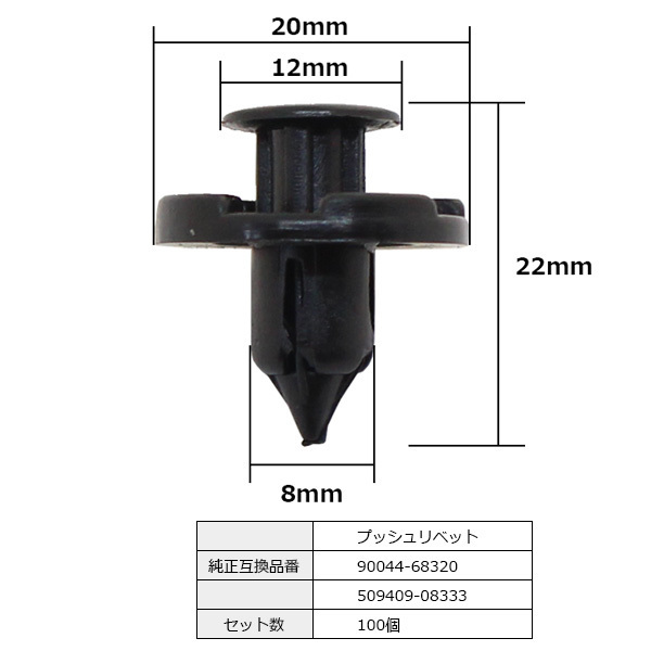 | 商品名稱 : | プッシュリベット クリップピン 内張りクリップ 純正品番 互換 90044-68320 09409-08333 トヨタ ダイハツ スバル系 100個 |
