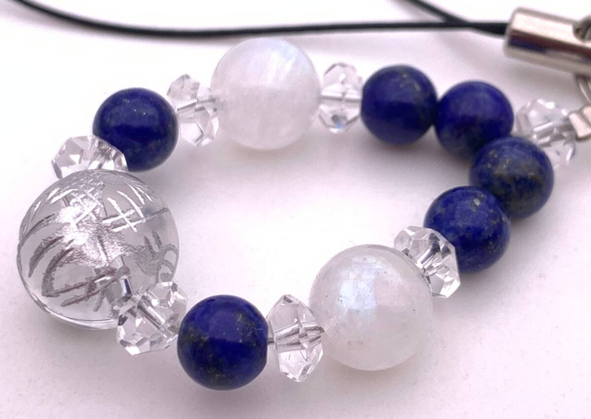 天然石水晶銀彫り青龍&ラピスラズリ&ムーンストーンのストラップ