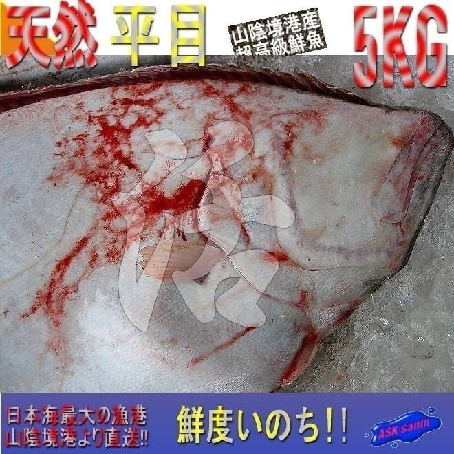磯の超高級魚 、 もちろん天然物!! 巨大です。 平 目 3kg~5kg 白身魚の代表格でもあります。 えんがわ といわれている1匹から ちょっとしか取れない部分は、珍味としてあまりにも有名。 刺身、あらい、煮付け、どう料理してもいける魚です。 . . . たまに、特大8kg以上の大物も上がります。 ご希望の方はメールにて連絡下さい。 日本海最大の漁港「山陰境港」より激安直送! . ※ なお、重量の増減により「3kgの落札価格」を基準として換算させていただきます。 例えば 3.5kgですと 「商品代金=落札価格×.3.5÷3」となります。 . 入札額= 1尾 3kgの値段 となります。 .. 釣り物ではありませんので〆てない場合がほとんどです。 日 本 海 最 大 の 漁 港 山陰境港 より直送 「本物」 の味を ど う ぞ ! ! 発送方法 冷蔵便 他商品との同梱 同梱不可同捆不可,商品會有獨立的日本運費。