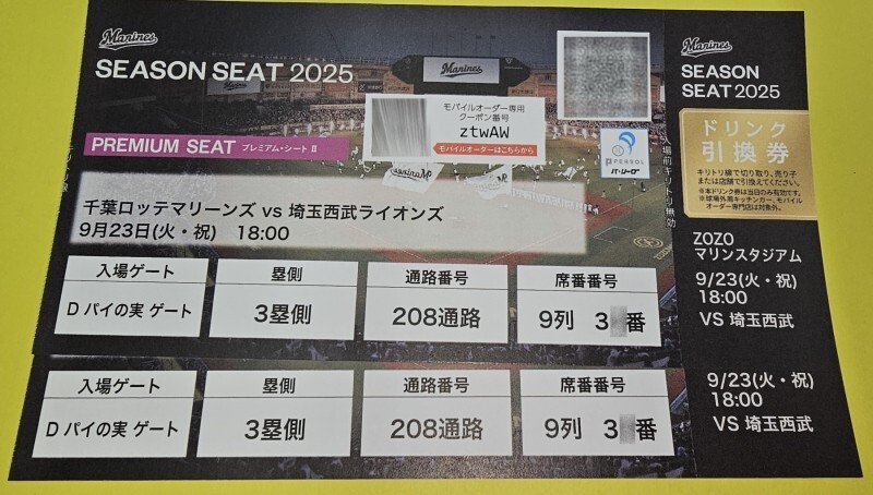 | 商品名稱 : | 2枚連番ペア 9月23日千葉ロッテVS埼玉西武プレミアムシート ZOZOマリンスタジアム |