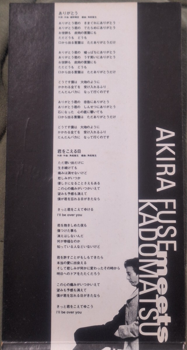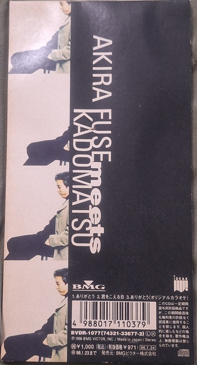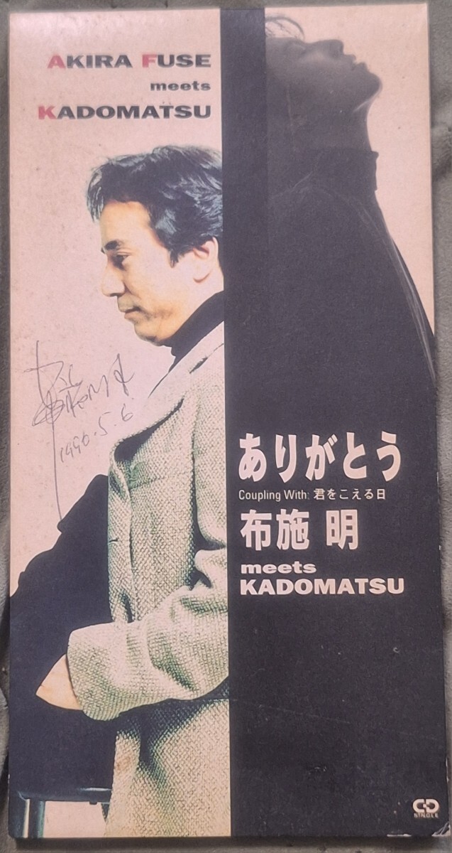 | ■サイン入り8㎝シングル SCD(BMG/ BVDR-1077)★ 布施明 meets KADOMATSU <ありがとう> ※布施明が★ 布施明 meets KADOMATSU★名義で1996年リリースされた『Estimado FUSE AKIRA MEETS KADOMATSU』から、シングル・カットされた<ありがとう>( BMG/ BVDR-1077)です。※カップリングには布施明がカバーを切望した角松敏生のオリジナル<君をこえる日>を集録しています。※1996年5月6日付けのサイン入りです。