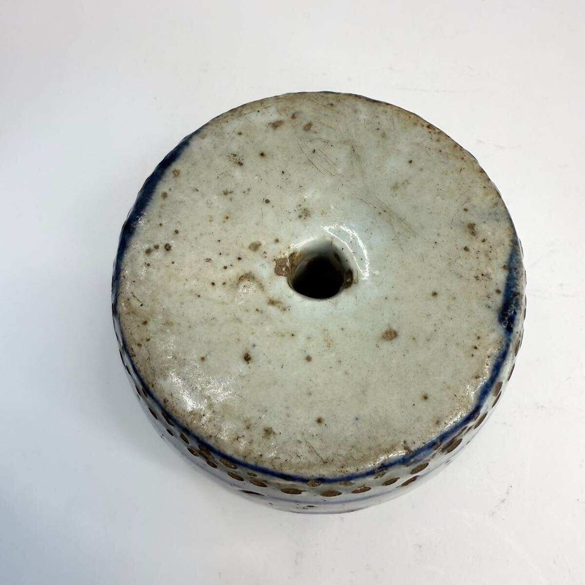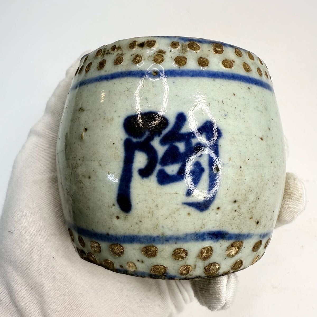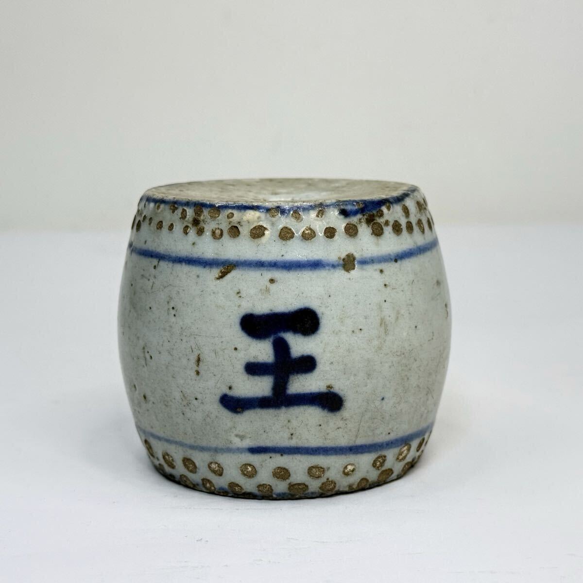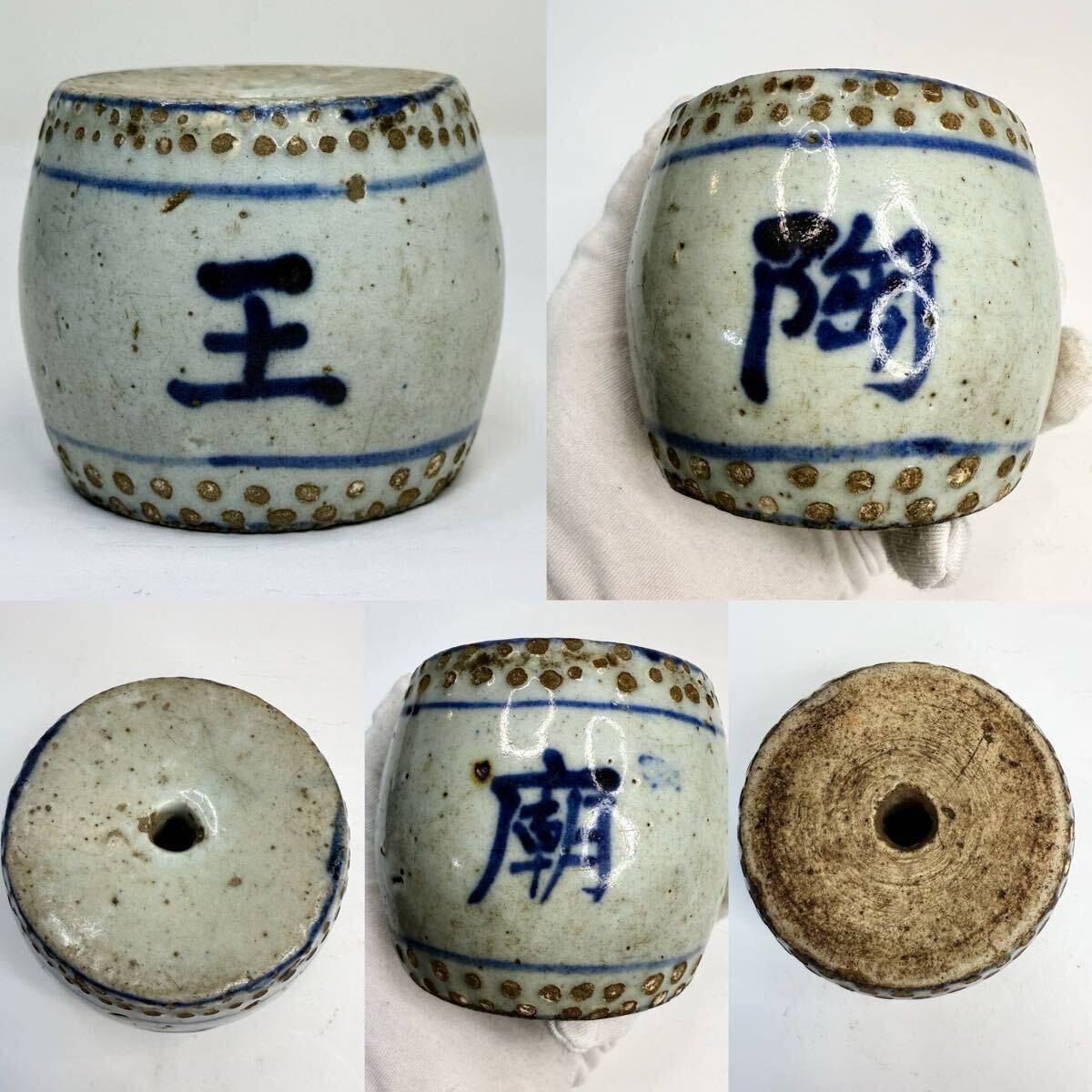 XMF-中国古美術 時代物 染付 文鎮 鼓釘型 文字図 書道具 文房四宝 文房具 唐物 陶磁易碎品限空運,非易碎品可使用海運。 器 中国古玩 骨董品 幅9.5cm高さ7.7cm