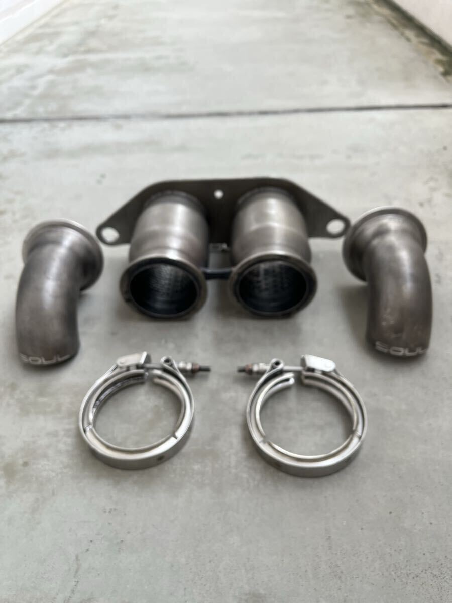 ポルシェ911 991.1/991.2 用音量抑制エキゾーストチップの出品です。 GT3RSに装着し、2000km程度走行しました。 雨天未走行ですが、排気系の為、それなりに汚れや傷は有ります。 もちろん、ヒビや割れもなく良好だと思います。 性能には問題ありません。 アメリカをはじめ世界中のサーキットで、騒音規制がますます厳しくなっています。GT3/RSオーナーの多くは、マフラーを交換すると騒音規制をクリアするのが難しくなり、厳しいサーキットでは純正マフラーでも規制に引っかかってしまうケースが増えています。SOULのボルトオン式レゾネーター付きターンダウンエキゾーストチップは、パワーロスを最小限に抑えながら数dBの騒音低減効果を発揮し、サーキットでわずか数分で交換可能です。 詳細: + ポルシェ991.1 / 991.2 GT3 / GT3 RS(911Rを含む、2014-2019年モデル)の全モデルに対応。純正センターマフラーまたは純正チップ取り付けプレートを使用するアフターマーケット製エキゾーストシステムにも適合します。 この製品は、アメリカをはじめ世界でも知名度の高いメーカーとなります。 ぜひこの機会に検討して頂ければ幸いです。 あくまでも中古品の為、ノークレーム、ノーリターンでお願いします。(2025年 11月 11日 20時 57分 追加) SOUL Performance ボルトオン式レゾネーター付きトーンダウンエキゾーストチップ一式に新たにワンオフテールパイプ、バッフル付きテールパイプセットでの販売となります。 これらの追加出品により、価格を見直させて頂きますのでご了承願います。 >