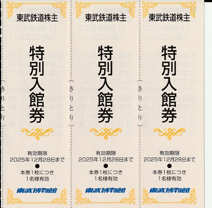 | ●東武動物公園 特別入園券+ライドパスご優待割引券の各3枚セットです。 ●有効期限は2025年12月31日までです。 ●入札価格は入園券+ライドパス割引券各3枚セットの価格です。 ●お支払金額は、落札価格+送料になります。 ●おまけとしまして、KFC・ドトールコーヒーショップお買物優待券3枚+東武商事運営店舗お買物優待券3枚+東武博物館特別入館券(有効期限2025年12月28日まで)3枚をお付けします。 | ||