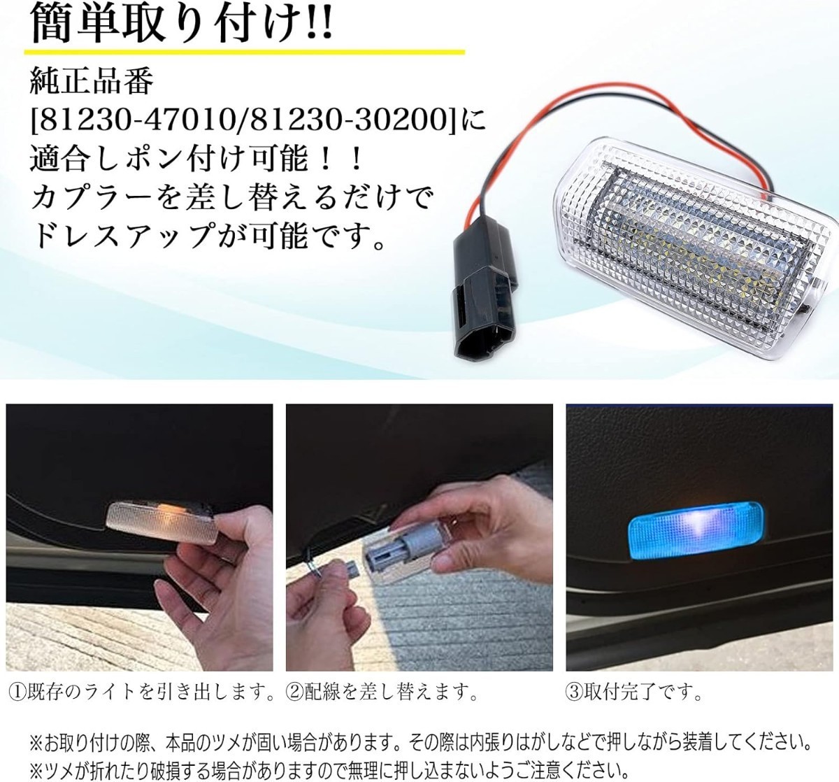TOYOTA LEXUS NISSAN SUBARU 等の車両に取り付け可能なLEDカーテシランプです。 LEDならではのスッキリとした発光色はもちろん、非常に明るく足元の照明としてだけでなく周囲や後方への注意喚起にもなり安全性も向上します。 防水もしっかりとされていますので耐久性にも問題なくご使用いただけます。 お取り付けも純正のカーテシランプを取り外してユニットごと交換するだけのカプラーオンですので、簡単に交換可能です。 適合車種は画像をご参照下さい。 製品仕様 カラー:アイスブルー 氷青 淡青色 LED基数:SMD 18発 / 左右 36発 明るさ:6000k 電圧:12V セット内容 LEDカーテシランプ × 2( 運転席側 助手席側) ※適合表に記載がある場合でもオプション・年式・グレードやモデルにより形状が異なる場合が御座います。現車にて形状をご確認の上でのご購入をお願い致します。 ※レクサスに関しましてはコネクター形状が特殊な為、型式や年式によって装着可否が分かれる場合が御座います。予めご確認の上、ご検討下さい。 ※価格を抑える為、厚さ制限のある格安発送方法でお送り致します。封筒直入れでのお届けになります。 ※仕事との兼業の為、最長で4日までお時間を頂く事が御座います。 LEDカーテシ ドアカーテシ カーテシー ランプ ライト トヨタ レクサス USトヨタ 北米トヨタ TOYOTA 日産 アルファー※請確認是否動物毛皮。動物毛皮製品屬於華盛頓條約条約牴觸物品,無法國際運送。 ド ベルファイア 20系 30系 エスティマ 50系 ハリアー 30系 60系 プリウス 20系 30系 40系 50系 クラウン 180系 ランクル プラド 150系 200系 LEXUS LS430/LS460/LS600h GS IS LC500 RC RX200 RX270 RX350 RX450h ドアランプ ドアライト フットランプ カーテシランプ カーテシライト タイヤ灯 スバル 警告灯 インテリア 内装 エクステリア ウェルカムランプ >