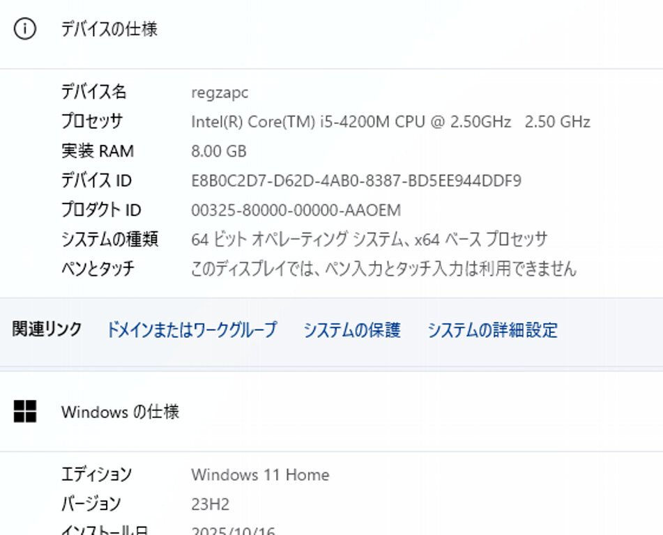 東芝 REGZA PC dynabook D51改 ホーム用一体型AV PCをテレワーク向けの構成にしました(オリジナルはD'71/PW) 大画面21.5インチ +フルHDを生かして等倍表示で複数アプリの同時作業が可能 表計算ソフトでは多くのセルを表示可能 Windows11 Home クリーンインストール 認証済み バージョン 23H2 中古PC活用のためWindows11 はTPM2.0の要件を満たせないのでRufusを使用してインストールしています。 ローカルアカウント user パスワード 空白で初期セットアップ済 すぐ使えます。 今後の大型バージョンアップはYuotube動画等参考に必要であれば行ってください。 CPU 第4世代 Core i5-4200M 2.50GHz セレロンより高性能 i7より省電力、低発熱 新品SSD 480GB 国産ブランドKIOXIA 2.5型に換装 HDDよりも省電力でストレス無しの高速起動 7200RPM HDD より圧倒的に早いランダムアクセス メモリー 4GBX2 計8GB 高速デュアルチャンネル構成 LCD 21.5インチ フルHD 1,920×1,080 DVDROM 市販DVD再生OK USB 3.0x4 USB 2.0X2 Wifi 11ac Bluetooth 有線LAN WEBカメラ ・テレワーク、オンラインミーティングに! Zoom(クラウドミーティングアプリ) 無料版インストール 動作確認済 ・Office系ソフト MS Office と高い互換性のあるフリーソフトLibre Officeを搭載 MS Officeにこだわる方には現在無料でMicrosoft 365が使えます 条件 マイクロソフトアカウントを登録(無料)してインターネット 接続状態で使用可能 画面左横の6個のファンクションボタンはWindows 10以降サポート対象外です。 画面消灯や外部入力切り替えですので不用意に押すと画面が消えます。 TVチューナーもWindows 10以降サポート対象外で使用不可です。ドライバー、再生ソフト対応していません。 付属品 ACアダプタ 東芝純正の無線キーボード、マウスとの接続確認はしてません。 有線か無線の汎用のキーボード、マウス、子機をご用意ください。 >