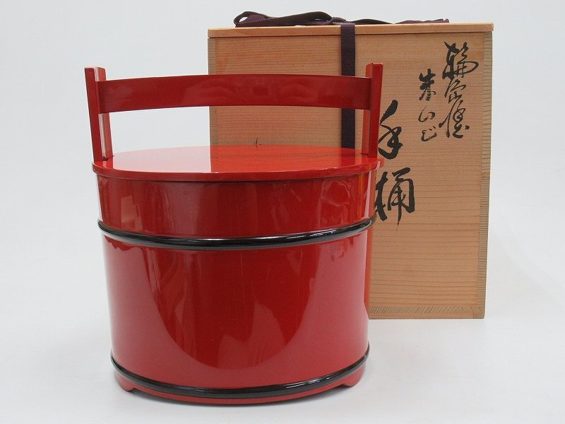 D3226 塗師 雅峰 輪島塗 朱塗 手桶 水指 木製漆器 茶道具 共箱 |