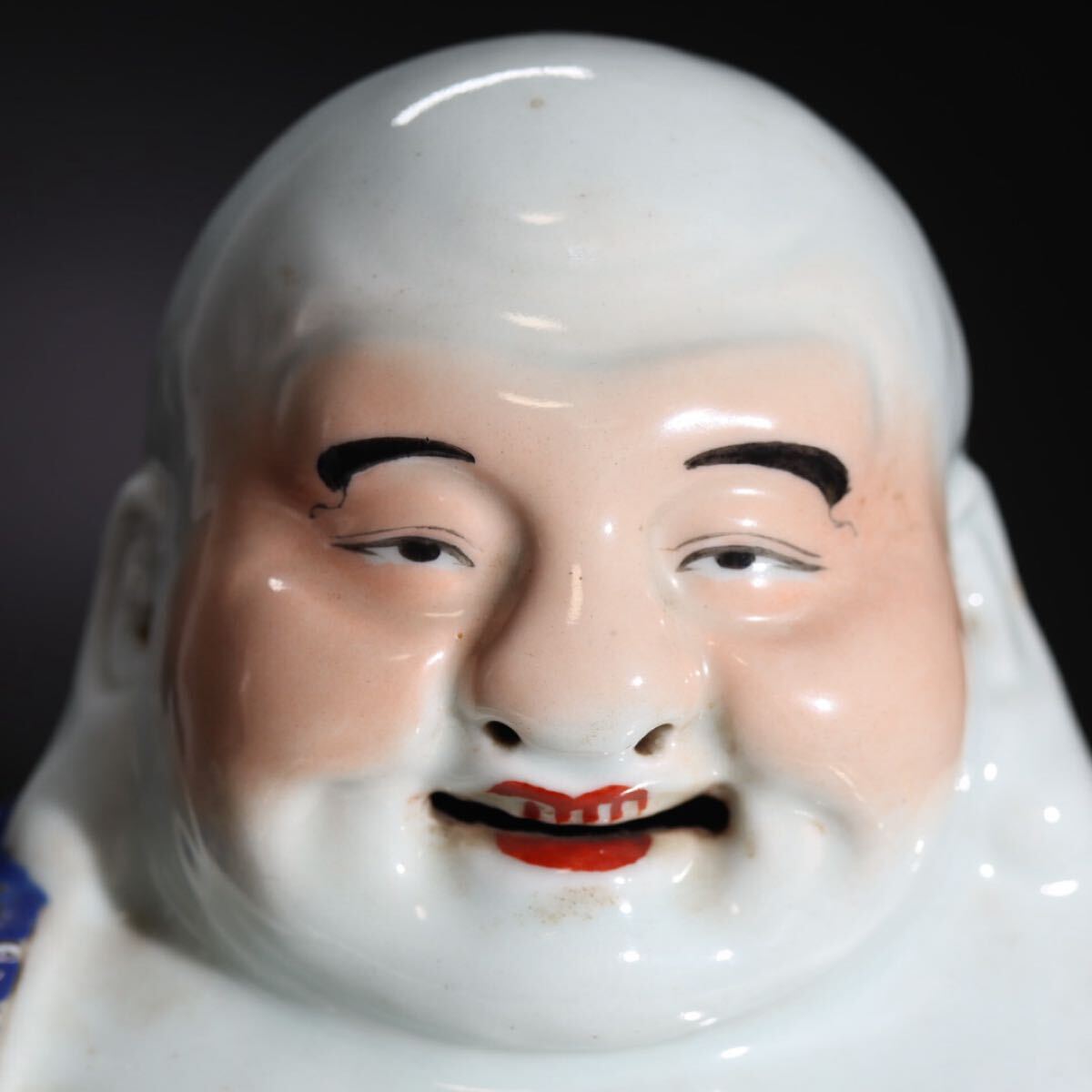 江西景徳 朱茂記造 底款 色絵 墨彩 布袋像 / 仏教美術 仏像 中国美術 陶器人形 粉彩 置物 煎茶飾 .G2940