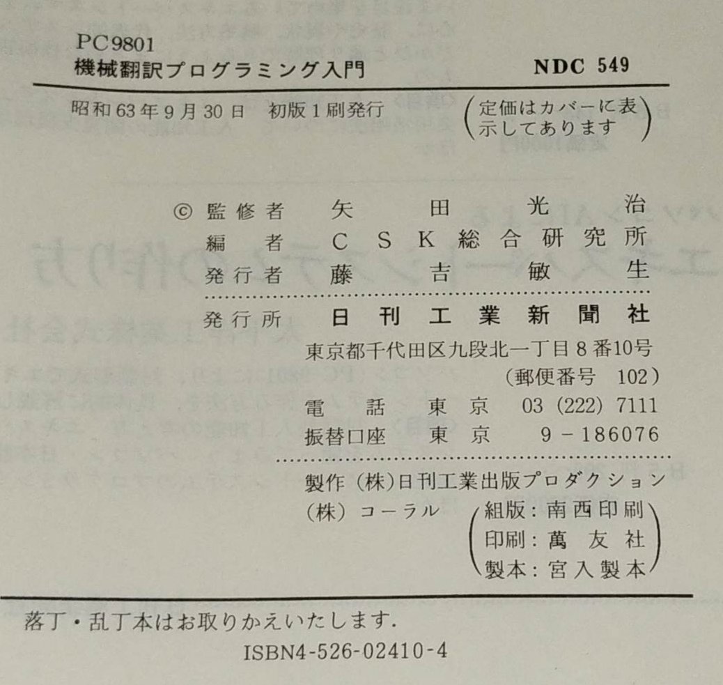| 商品名稱 : | 【除籍本】PC9801 機械翻訳プログラミング入門 CSK総合研究所 矢田光治 日刊工業新聞社【ac03f】 |
