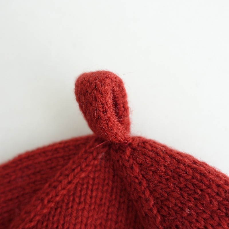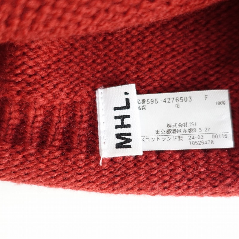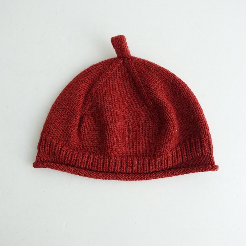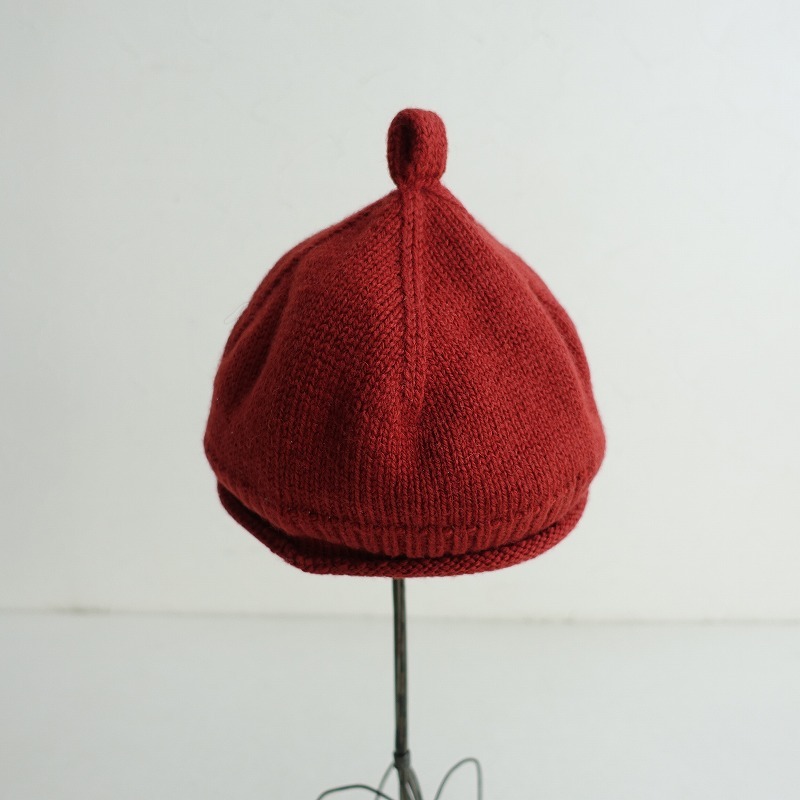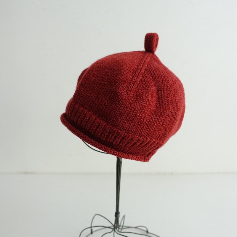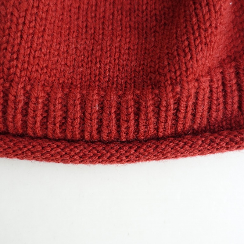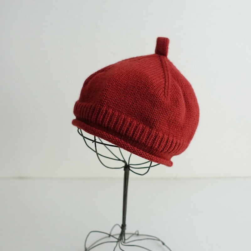 | 2024年コレクション、MHL.のROLLED HEM BEANIE ニットキャップです。カラーはエンジで、毛100%のニット素材であしらわれており、被り口はロールしたデザインで、トップにループが付いています。 |