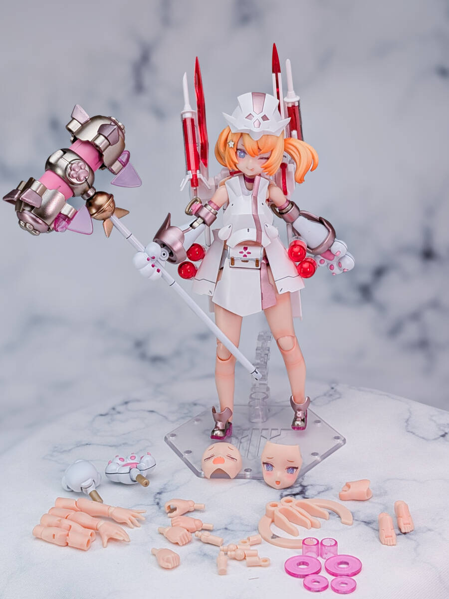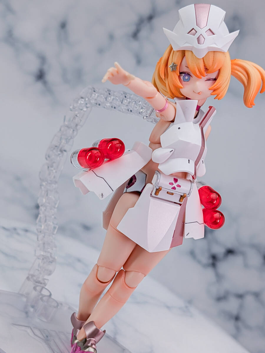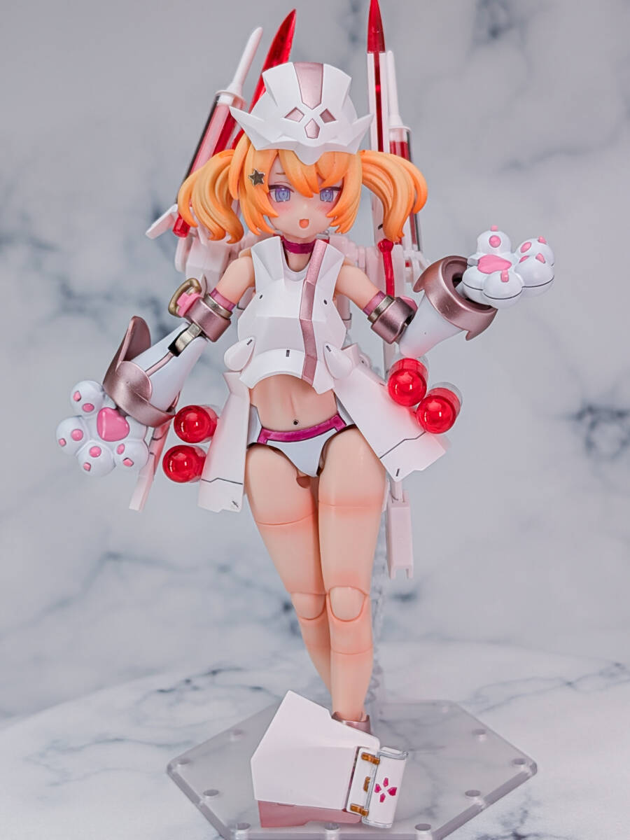 コトブキヤのプラモデル、メガミデバイス puni☆mofu マオの塗装済み完成品です。 コトブキヤのメタモルフォーゼユニットを使って、ナースっぽくミキシングしました。 腰パーツは磁石で取り外し可能です。 パーツのクリアランスを調整しております。 塗装はグラデーションを多めにしてあります。 ■内容物 本体、武装(10枚目の画像にあるものが全てになります。) ■基本工作 ゲート処理 表面処理 パーツ洗浄 塗装 墨入れ デカール貼り トップコート ■工作 メタモルフォーゼユニットを使ってナースっぽくミキシングしました。 腰のパーツは磁石で接続してます。外したときはお腹側はピアスっぽくなるよう1mm軸の磁石を使いました。 お腹、肩、腕等をタミヤセメントで合わせ目消ししております。 関節がきつい箇所が多かったのでクリアランスを調整しました。 塗装はグラデーションを多めにしました。 トップコートはセミグロスクリアとクリアです。 ■塗装 ガイアノーツ、クレオス、タミヤのラッカー、シタデルカラーで塗装しました。 髪はライトオレンジ、ホワイト、クリアオレンジを使ってグラデーション 肌パーツはラスキウスのクリアペールレッドでグラデーション 白パーツはブリュンヒルトホワイト ピンクパーツはメカトロウィーゴのぴんく、クリアピンクでグラデーション ゴールドはレッドゴールド シルバーはチタンシルバー サフはガイアのサーフェイサーEVOホワイト トップコートはガイアノーツのとセミグロスクリアプレミアムとGGXクリアー