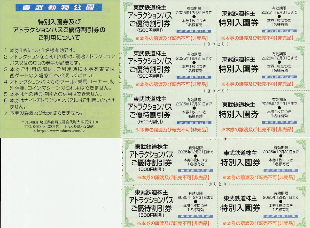| ●東武動物公園 特別入園券+ライドパスご優待割引券の各5枚セットです。 ●有効期限は2025年12月31日までです。 ●入札価格は入園券+ライドパス割引券各5枚セットの価格です。 ●お支払金額は、落札価格+送料になります。 ●おまけとしまして、KFC・ドトールコーヒーショップお買物優待券5枚+東武商事運営店舗お買物優待券5枚+東武博物館特別入館券(有効期限2025年12月28日まで)5枚をお付けします。 | ||