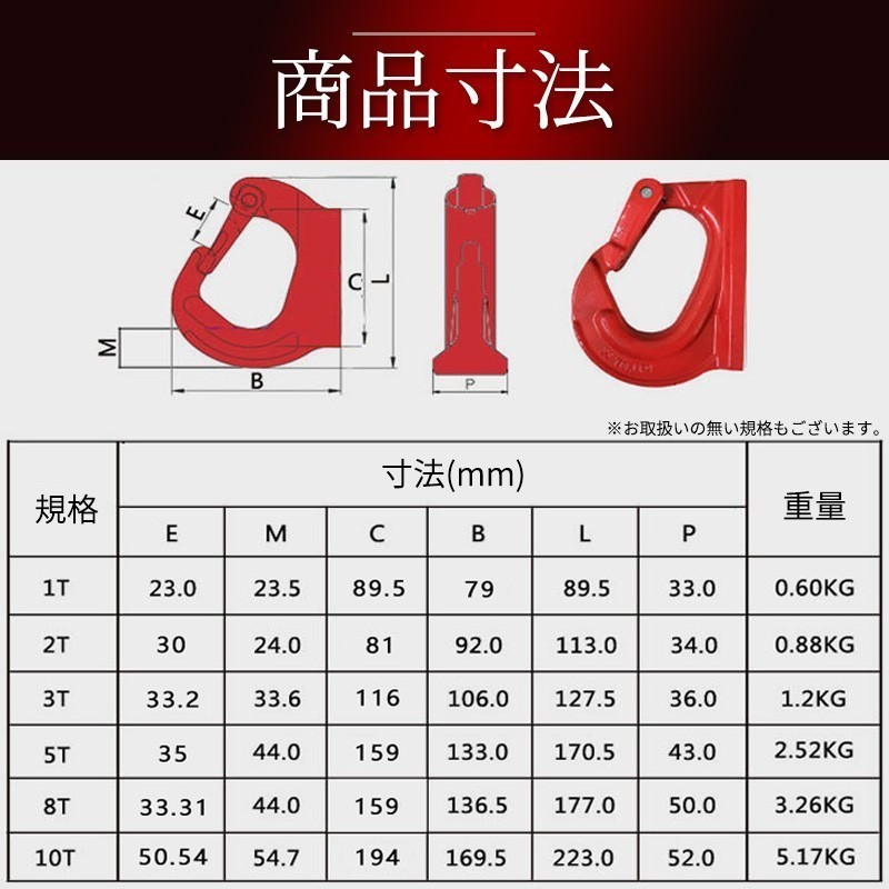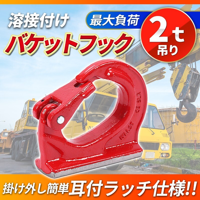 2t バケットフック ユンボ 溶接 吊り上げ アタッチメント 油圧ショベル 転圧機 ランマ プレート クボタ ダンプ コマツ 日立 閲覧ありがとうございます。 当商品は購入後24時間以内に発送しております。 最短翌日到着でお急ぎの方も安心です。 【商品説明】 こちらは建設や土木の現場の必需品、バケットフック2t用です。 同規格、他規格も在庫ございますので、同時購入でお値引き可能です。 油圧ショベルやユンボに溶接して取付け、ランマや転圧機等の重機を釣り上げたり、プレートをダンプに積み下ろしする際に重用します。 フック部は玉外し、玉掛けの際に手早く作業を行うことができる耳付きラッチとなっておりますので安全かつ効率的に作業を行うことができます。 溶接面は平らになっておりますので、アイデア次第で様々な面に取付けすることができます。 マテリアルにはG80合金鋼を使用しておりますので非常に頑丈で耐久性が高く、表面には防錆塗装をしておりますので錆に強く、長期間お使い頂くことが可能です。 生産も安心の認定工場でしており、生産時や商品発送時にしっかりと検品を行いますので不良品の可能性はほぼございません。 ※万が一不良品がありましたら、全額返金、または代替品交換させて頂きます。 【商品仕様】 1t:全長90mm、溶接面長89mm*幅23.5mm、重量約0.6kg 2t:全長113mm、溶接面長81mm*幅34mm、重量約0.88kg 3t:全長127.5mm、溶接面長116mm*幅35mm、重量約1.2kg ※その他の規格も画像掲載がございますのでご参照ください。 【注意事項】 取付につきましては専門的な知識がある方、または専門店にて行ってください。 玉掛け作業は玉掛技能講習修了者やそれに準ずる方が行ってください。 商品に塗装ムラやハゲがある場合がございます。 これらは返品交換の対象外となりますので予めご了承ください。 安価にご提供するため、過剰な梱包は省いております。 モニタや画面により色味が異なって見える場合がございます。 >