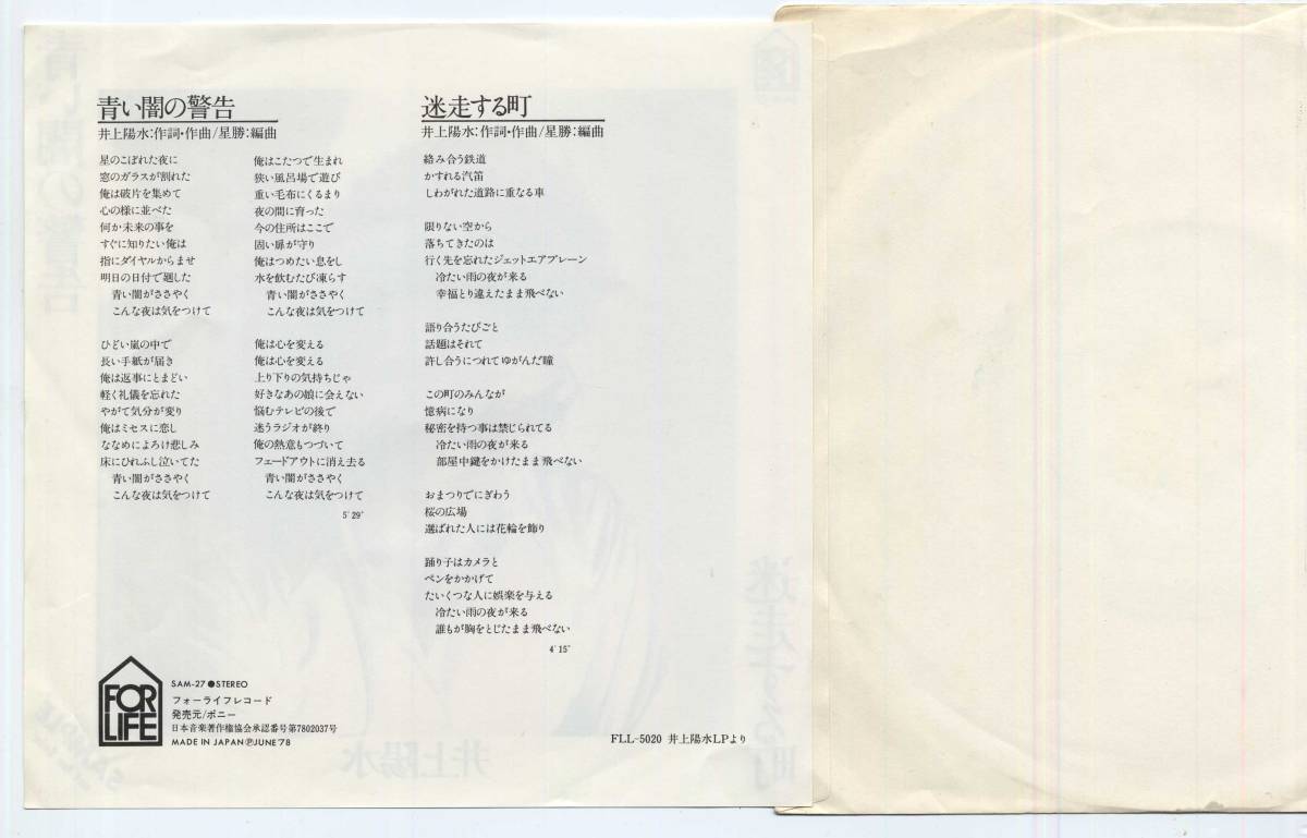 | 商品名稱 : | シングル★井上陽水/青い闇の警告(プロモ/FOR LIFE,SAM-27,'78)★Yosui Inoue |