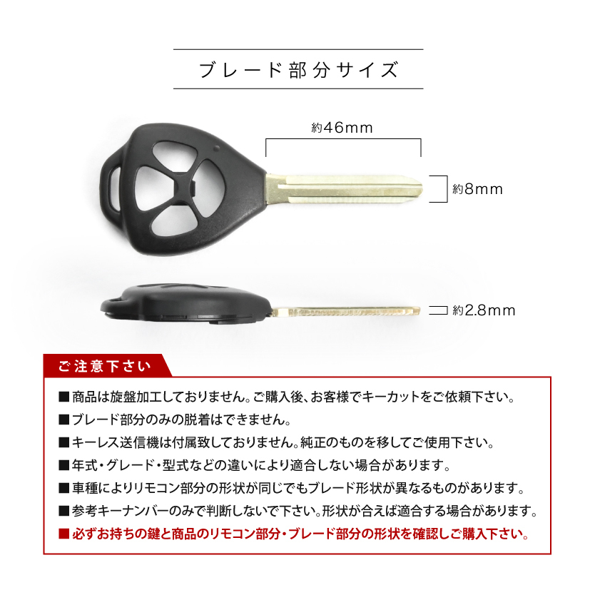 | 劣化や破損・紛失時のスペア用に! 規格:TOY43 M382 ブレード部分サイズ:長さ:約46mm、幅:約8mm、厚さ:約2.8mm 参考キーナンバー:50001-69999 ブランクキー04 【確認事項】 ※商品は旋盤加工しておりません ※ご購入後、お客様でキーカットをご依頼下さい ※ブレード部分のみの脱着はできません ※キーレス送信機は付属致しておりません。純正のものを移してご使用下さい ※年式・グレード・型式などの違いにより適合しない場合があります ※車種によりリモコン部分の形状が同じでもブレード形状が異なるものがあります ※参考キーナンバーのみで判断しないで下さい。形状が合えば適合する場合があります ※必ずお持ちの鍵と商品のリモコン部分・ブレード部分の形状を確認しご購入下さい |