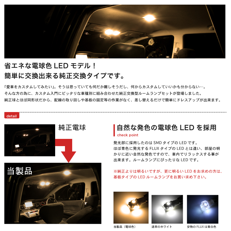 ★車中泊・キャンプにもオススメ★ 入門に最適な電球色のエントリーモデル! 簡単に交換出来る電球色の純正交換タイプです。 「愛車をカスタム古董商品,有可能客製化、修改、換過零件,請下標錢注意。 してみたい」。そうは思っていても何だか難しそうだし、何からカスタム古董商品,有可能客製化、修改、換過零件,請下標錢注意。 していいかも分からない…。そんな方の為に、カスタム古董商品,有可能客製化、修改、換過零件,請下標錢注意。 入門にピッタリな車種別に組み合わせた★電球色★純正交換型ルームランプセットが登場しました。純正球とほぼ同形状だから、配線の取り回しや基板の固定等の作業がなく、差し替えるだけで簡単にドレスアップが出来ます。■自然な発色の電球色のSMD LEDを採用 発光部に採用したのはSMDタイプの電球色LEDです。ほぼ青色に発光するFLUXタイプのLEDとは違い、部屋の明かりに近い自然な発色ですので、車内でリラックスする事が出来ます。ルームランプにぴったりなLEDです。純正よりは明るいですが、更に明るいLEDをお求めの方は、基板タイプのLEDルームランプをお買い求め下さい。 ■純正球と交換だけの簡単取り付け 純正球とほぼ同じサイズ・形状だから、入れ替えるだけでLEDに交換出来ます。特別な知識も必要無く、気軽にカスタム古董商品,有可能客製化、修改、換過零件,請下標錢注意。 出来ます。 ■車種に合った形状のセットです 車種に合うように形状を合わせたセット内容ですので、難しい事を考えずに純正球とただ交換するだけで装着出来ます。
