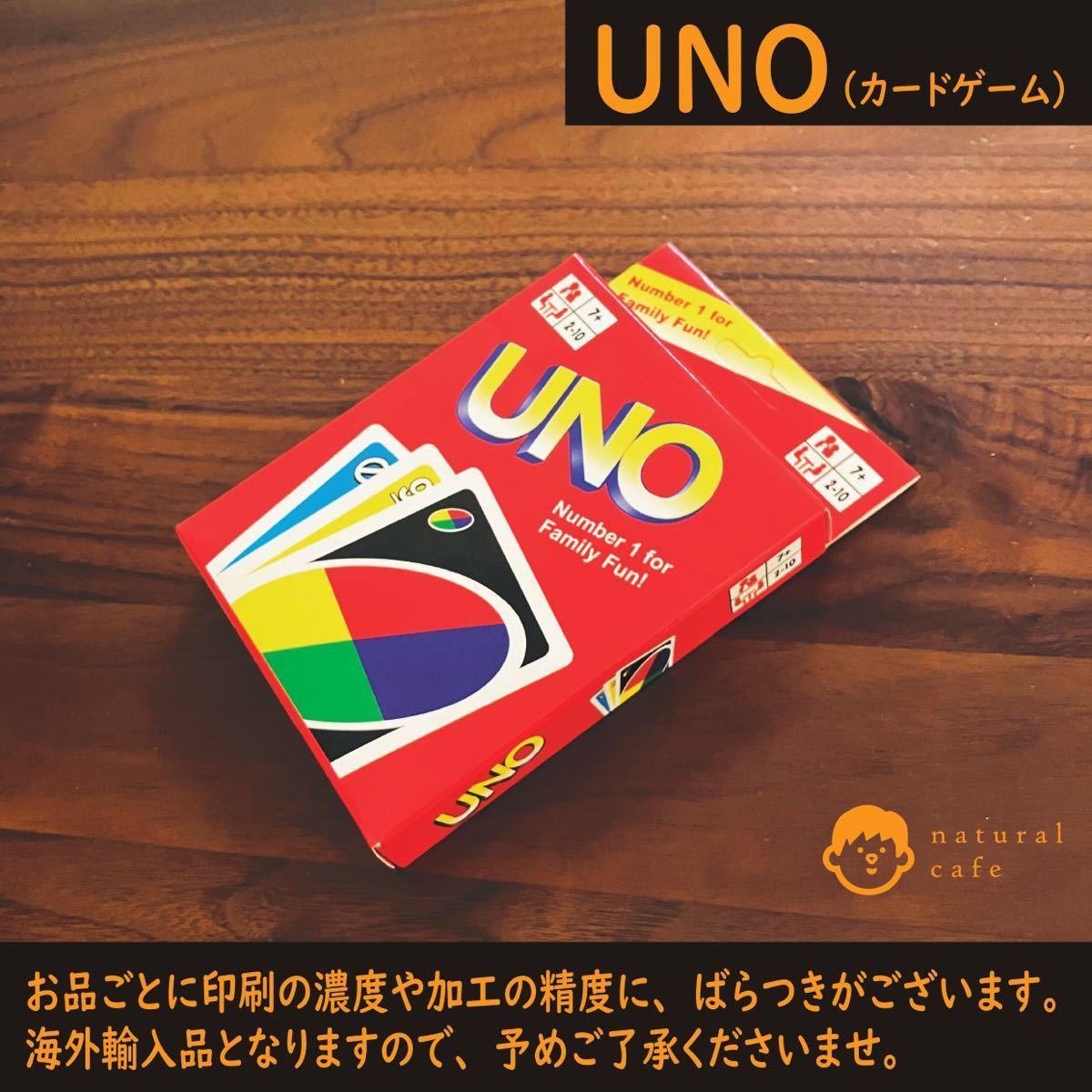 UNO(ウノ)、カードゲームです。 ・ ※海外輸入品の為、印刷の濃度・加工の精度にばらつきございます。 ※製品に紙粉が付いている場合がございますが、印刷時の紙粉ですので、予めご容赦下さいませ。 価格をお値打ちにさせていただいておりますので、 ご購入いただけます際は、予めご了承ください。 ・ ・ 【売り切れましても下記から同じお品をご購入可能です】 ・ ■商品情報■ 【分類】 カードゲーム(UNO) 【サイズ】 カード:85×55mm(角丸) 【素材】 紙素材 【重さ】 約160g(ケース含む) 【発送方法】 匿名配送― ※お送りする際は、プチプチに巻いた簡易包装となります― 輸送中にケースが破損・潰れてしまう可能性があります― プラス50円で、ケースが潰れないように梱包してお送りすることも可能でございます。― ご心配なお方は、ご購入前にコメントくださいませ。 【特記事項】― 海外輸入品の為、説明書の記載が英語となります ・ ・ ■お品物の画像は、照明やPCモニターの環境により、実際のお色とは多少違って見える場合があります。 ■ご不明な点は、お気軽にご質問下さいませ。 ・ ・・