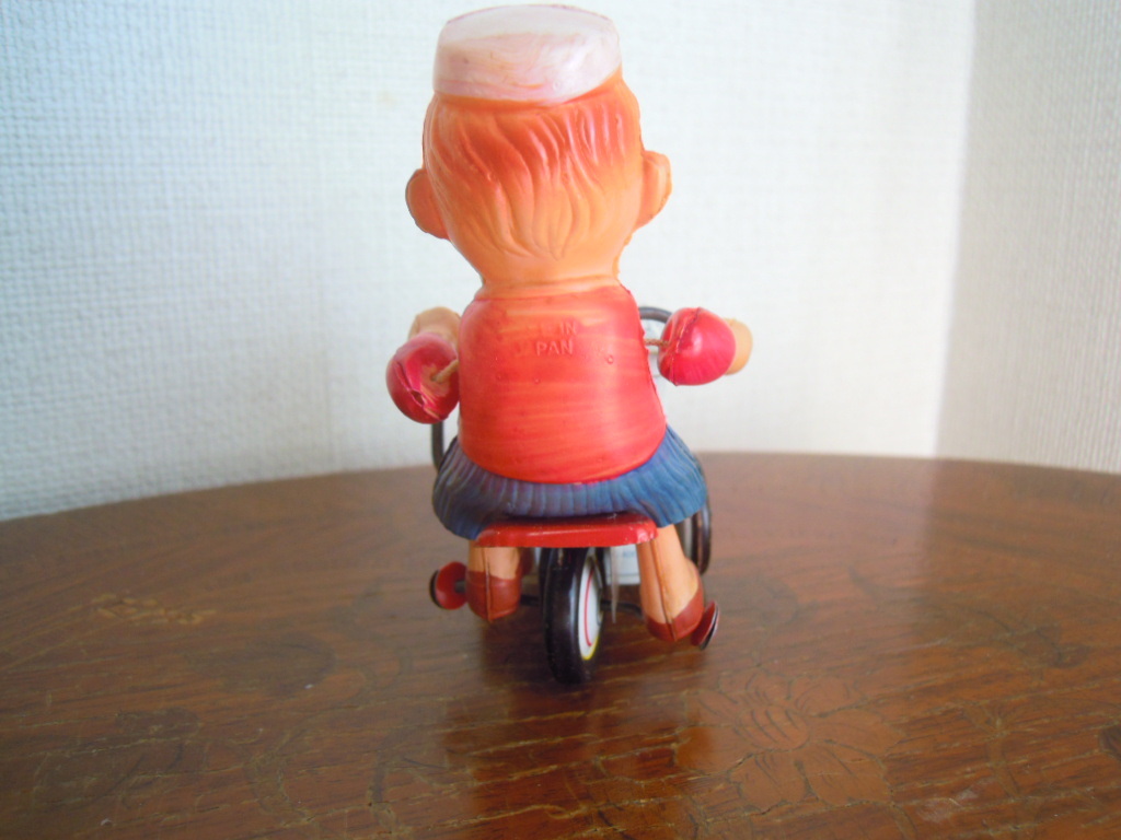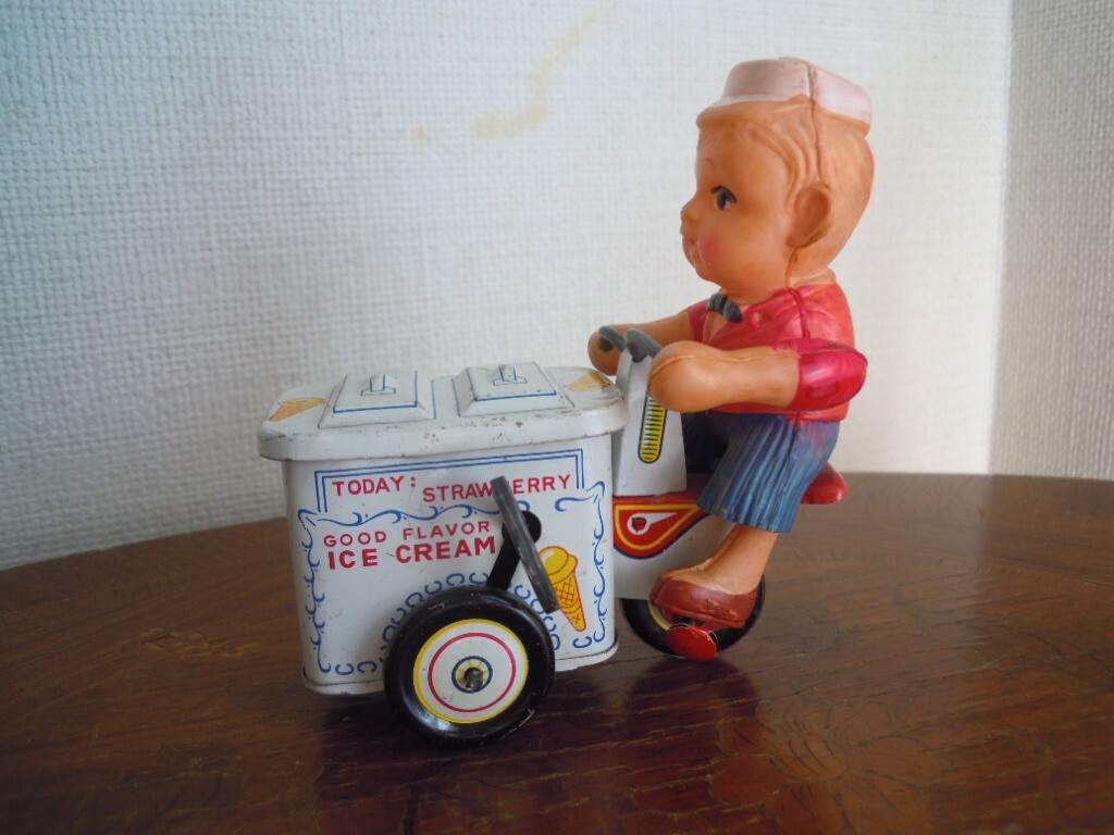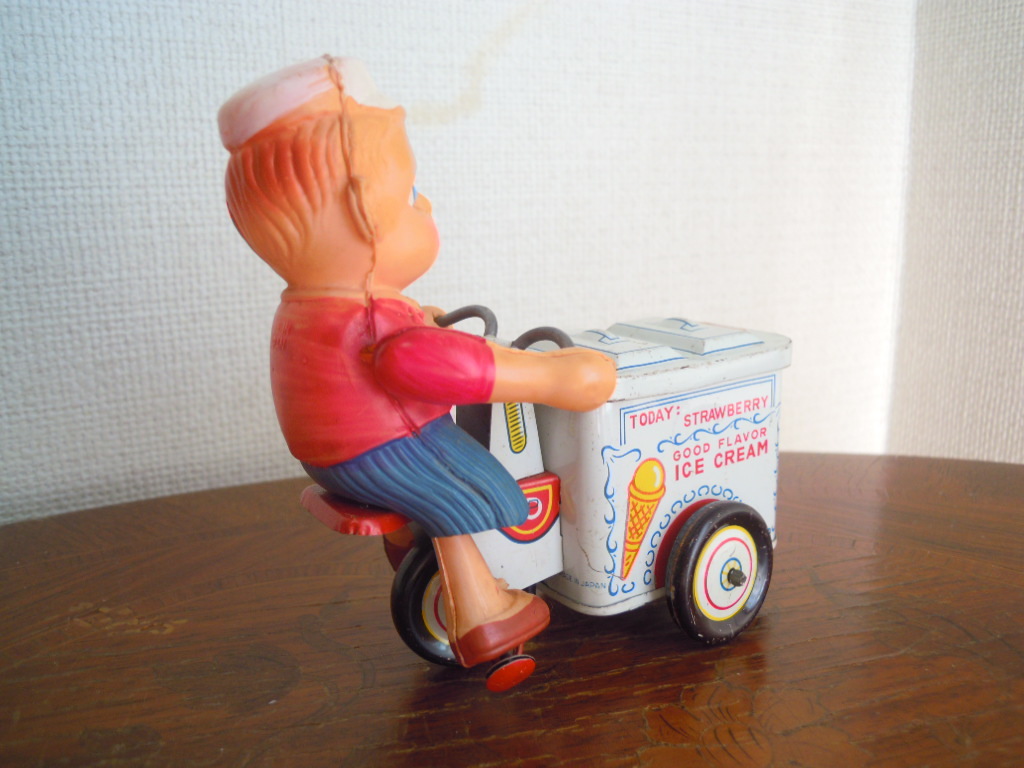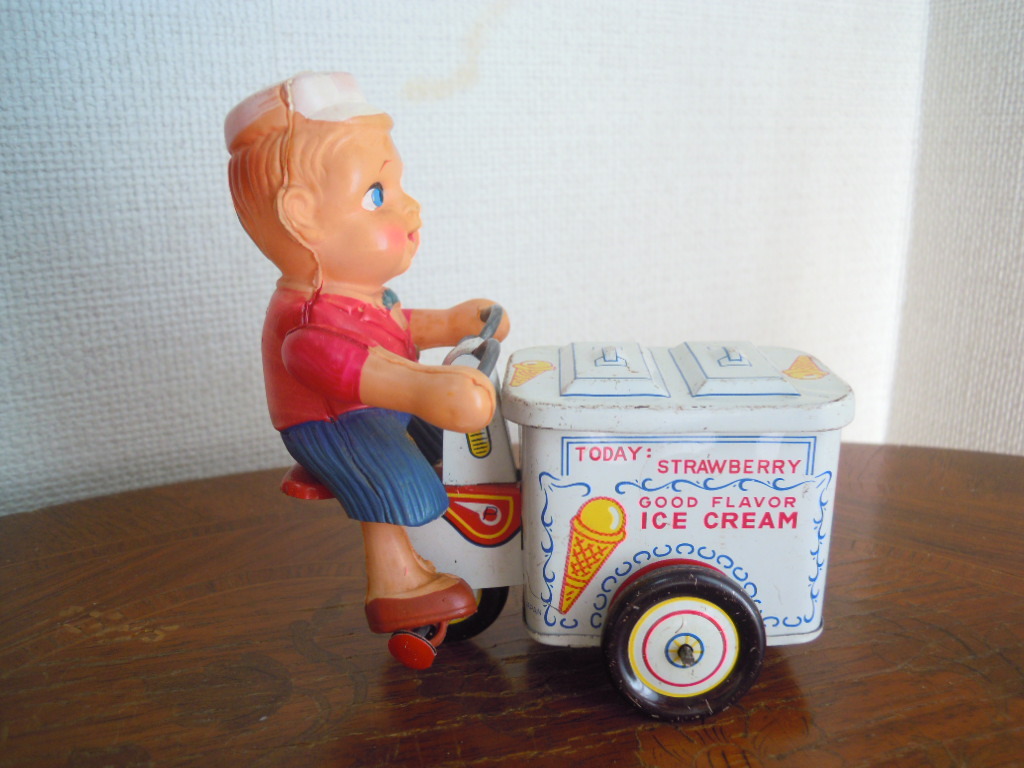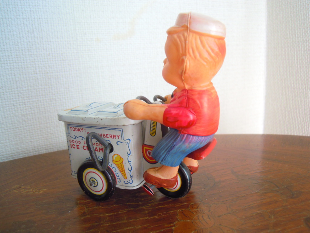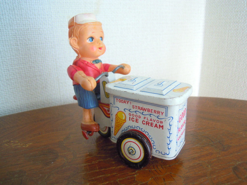 | ★商品説明★ | {商品} アイスクリーム売りの少年 {サイズ} 10cmx4.5cmx10.5cm (少年まで) {マーク} 少年の肩の所に Made in Japan {状態} 内蔵するゼンマイを巻きますと、少年は 両足でペダルを勢い良く踏み、円を描く 様に進みます。 セルロイドの少年にも、凹み、塗料の剥げ、 傷等無く綺麗な状態です。 商品をご覧頂き有難う御座います。 |