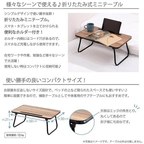 ●現代社会のインテリアテーブル ケーブルに繋いだままスマホやタブレットを視聴できる便利な溝が特長。 ONではテレワークで、OFFでは動画視聴やリモート飲み会で大活躍! ●リビングやベッドサイド、和室などお好きな場所でパソコンワーク 趣味・仕事に集中できる自分だけのスペースが作れます。 ●軽量・頑丈なスチールフレーム 軽量&丈夫!持ち運びや移動にもラクラク。 ●おしゃれな木目調 ●組み立てカンタン&コンパクト収納 たたんでいる脚を開くだけ!使用しないときはコンパクトに収納できます。 ●タブレットなどが立てて置けるスタンド搭載! 手で持たなくても動画を楽しめます。 ●お子さまの机にピッタリ お絵かき・ままごとなどする時に、サッと簡単組み立て。 ●軽量なのでアウトドアに レシャー、キャンプに持って行ってちょこっと置きに便利。 本体サイズ:(約)幅50×奥行き30×高さ21cm 耐荷重:10kg