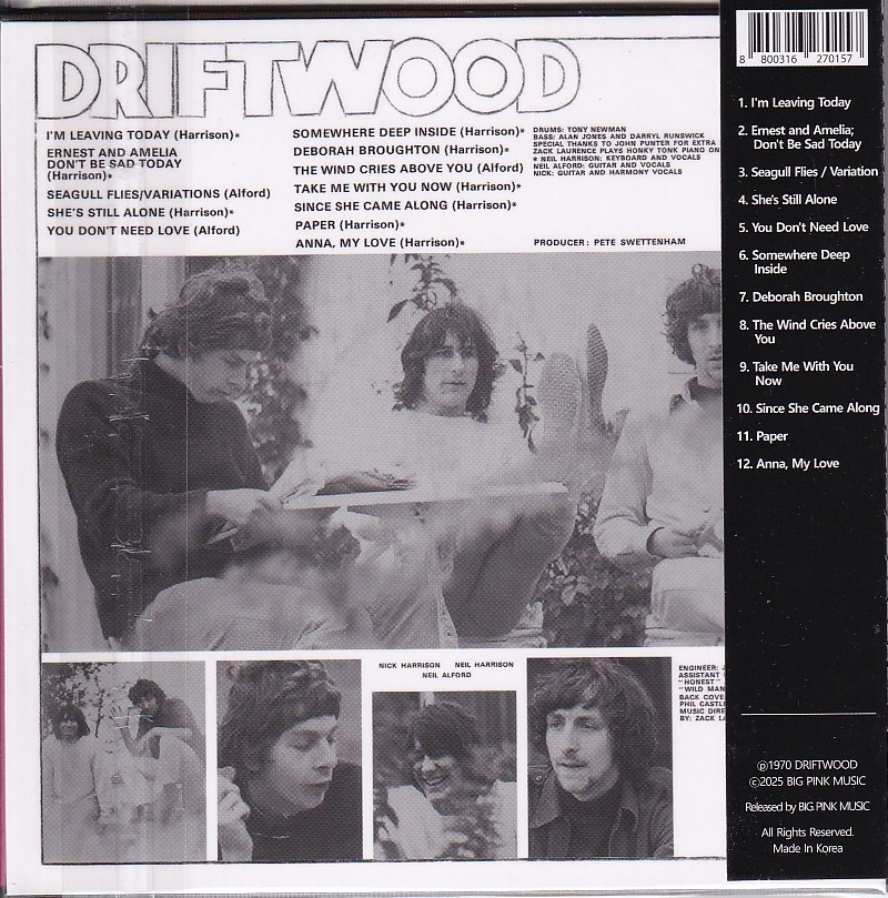 COMMENT 商品の原産国:韓国 アーティストの母国:英国 レーベル:BIGPINK カタログ番号:Bigpink998 新品CDです。英国産ソフトロック/ポップ・バンド、70年唯一作。ポップなメロディと美しいハーモニが印象的な英国ポップサウンド。傑作。紙ジャケット仕様。 検索用:Driftwood、S/T、BIGPINK _QCD _ZUK _BIGPINK _PROG