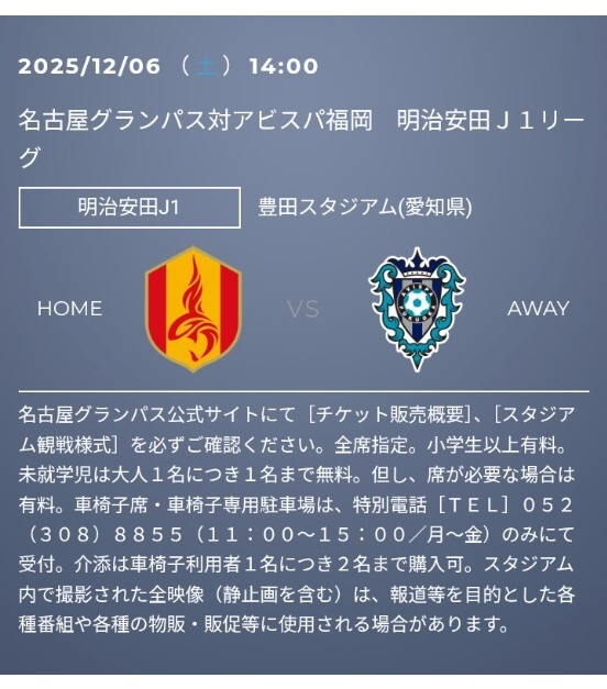 | 商品名稱 : | 12月6日(土)14:00 名古屋グランパス 対 アビスパ福岡 豊田スタジアム C指定席【Sスタンド】2階 QRチケット 1席分 手数料・当日引換不要 |
