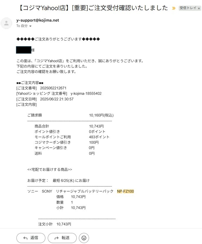 (2025年 11月 10日 9時 57分 追加) 2025.11.10追加:ビックカメラグループのコジマにて、6月22日に新品を購入しました。購入履歴の写真をアップロードします。