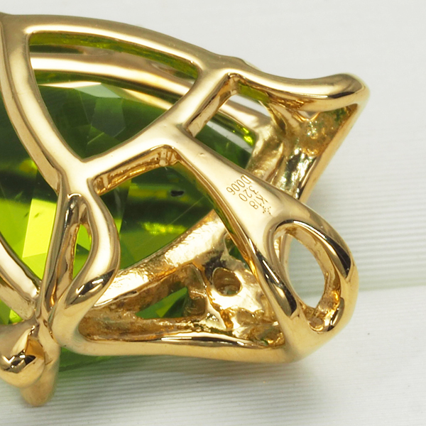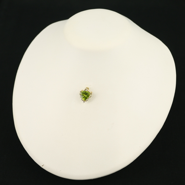 僅かに見える内包物も気にならないほど透明感に溢れたペリドットのペンダントトップ。ダイヤモンドとゴールドの繊細な彫金デザインも素敵ですよ。 |