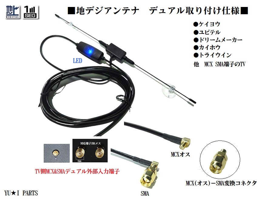 □商品詳細 持ち運びが容易で配線作業が必要の無い楽々吸盤メタルポール式 ワンセグ・フルセグ兼用ブースター内臓地デジアンテナです。SMA変換プラグが付いていますので幅広い機種に対応します。