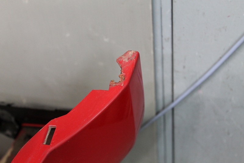 状態詳細 取り付け部破損有りの為Eランクとなります(写真2枚目+8枚目) 上部に塗装のクリア劣化ハゲ多 全体ウスキズ多 線キズ多 飛び石キズ少し 汚れ多 樹脂部分色あせ多 底面にガリキズ多 全体的に状態がよくないため補修や再塗装を前提にご検討をお願いいたします【色番号:レッド 赤】