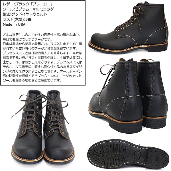 スペック レザー:ブラック「プレーリー」 ソール:ビブラム・430・ミニ・ラグ 製法:グッドイヤーウェルト ラスト(木型):8番 Made in USA