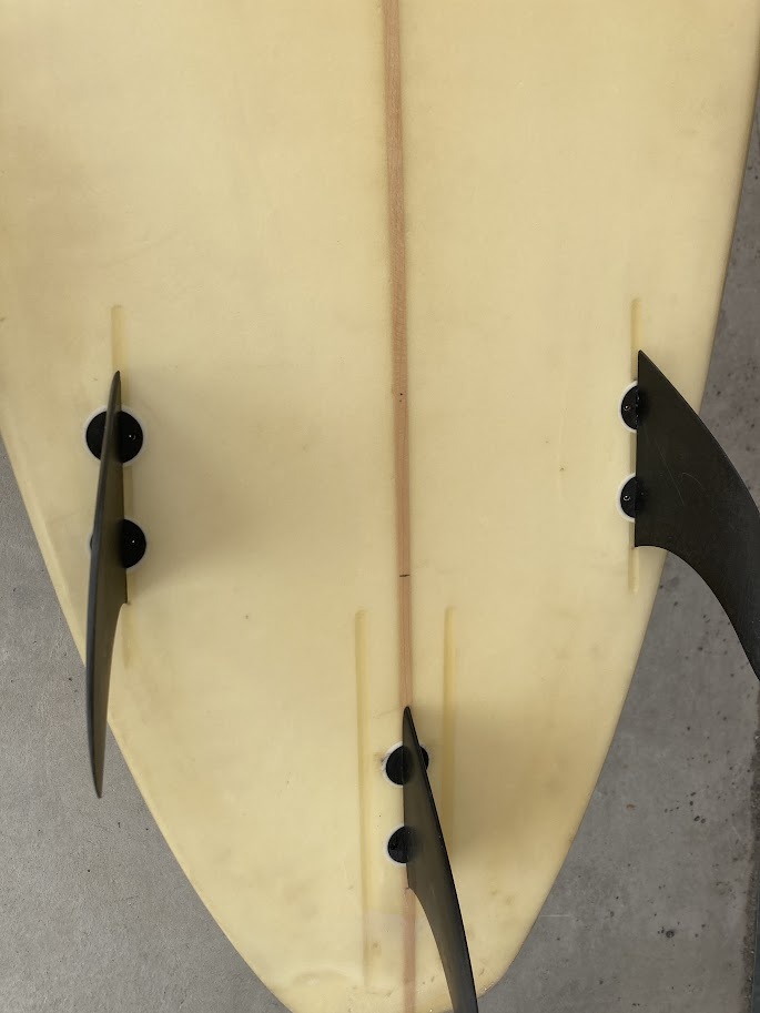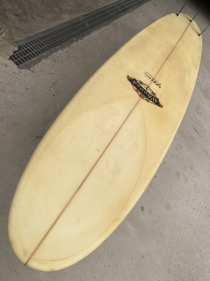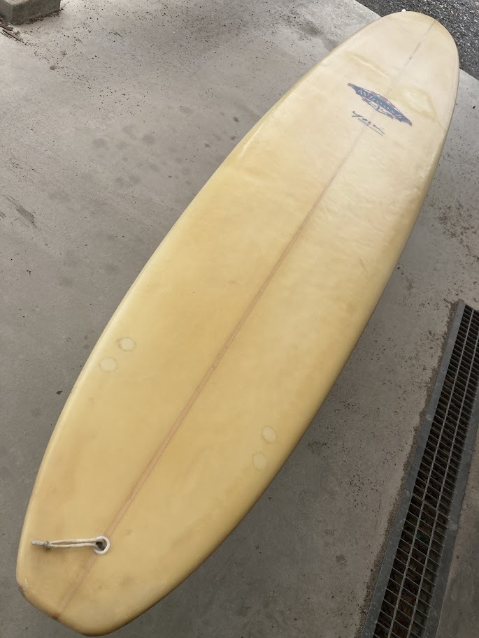 EPS特有の黄ばみやステッカーのがし跡が見られますので格安出品しますがボードの性能自体は全く問題なくそれどころかかなりのパフォーマンスを発揮するマジックボードです。シェイパーはヨッチこと松山欣則プロ・・今は鴨川の歴史あるサーフィン文化を継承する一人ですね。重さはフィン付きで約6kgと軽量。しかし風に煽られるような軽さではなくオモカルでしなりのある加速性の高いボードです。EPS特有のテイクオフの速さとマニューバー性の高さを両立しています。なかなかこういうタイプのボードはオーダーしないと在りません。サイズの上がった日や駐車場から遠いポイントなどでのサーフィンも憂鬱になる事はもうありません。テールにわずかな小擦り傷の樹脂による修理跡は見られますが大きな事故歴や修復歴も有りません。この日焼けを趣と捉えられる方には非常にお得なボードではないでしょうか?