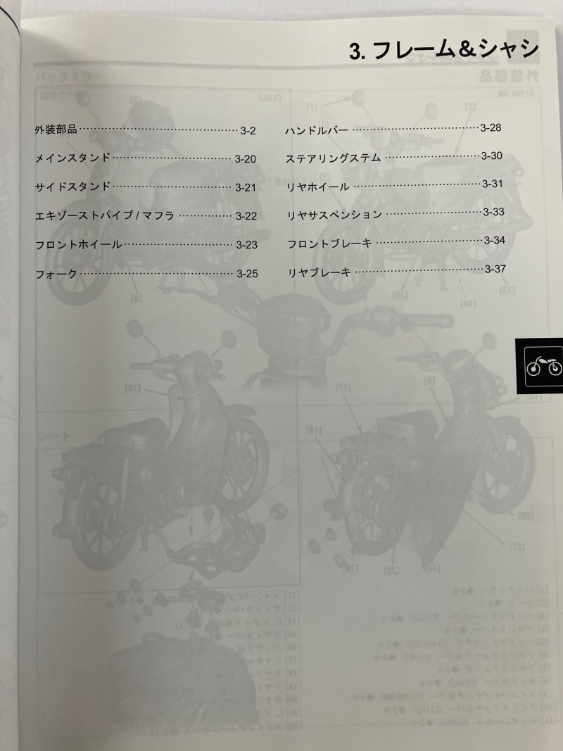 ■お支払い方法、配送方法、送料は購入手続き画面で確認できます。 ●対応機種名:C110J / C110X / C110KM / C110BN (スーパーカブ110 / クロスカブ110 / くまモンバージョン / スーパーカブ110プロ) ●対応型式:8BJ-JA59 / 8BJ-JA60 / 8BJ-JA61 ●メーカー製造年式:2022年以降 ●メーカー品番:60K8870 ■スーパーカブ110/クロスカブ110/スーパーカブ110プロ(JA59/JA60/JA61) に対応しています。機種編です。 当商品は機種編ですので、共通編と一緒にご利用ください。 ■スーパーカブ110プロの追補版が一緒に製本されて1冊になりました。 ■新品未使用です。ホンダより直接取り寄せた正規品(受注生産品)です。 配線図は白黒です。 ※注意事項 ごく稀に破れや折れがある場合がございます。 ホンダに内容に問題がない場合は交換不可とされているため、入荷した商品をそのまま販売しております。 申し訳ございませんが、予めご了承ください。<サービスマニュアルについて> サービスマニュアルには、通常おこなう点検、調整をはじめ、主要部の分解点検、組立整備要領が説明されております。 ・バイク販売店を対象としているマニュアルです。内容は専門知識が必要となる場合がございます。 *表紙等発売当初と異なる場合がございますが、掲載内容は各車両が発売されていた当時の物です。 *掲載内容のパーツやデータ等更新されている場合や、すでに生産中止している場合もございます。 <店舗よりご案内>