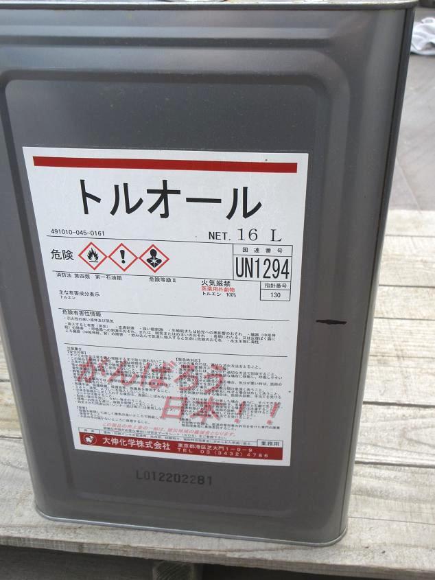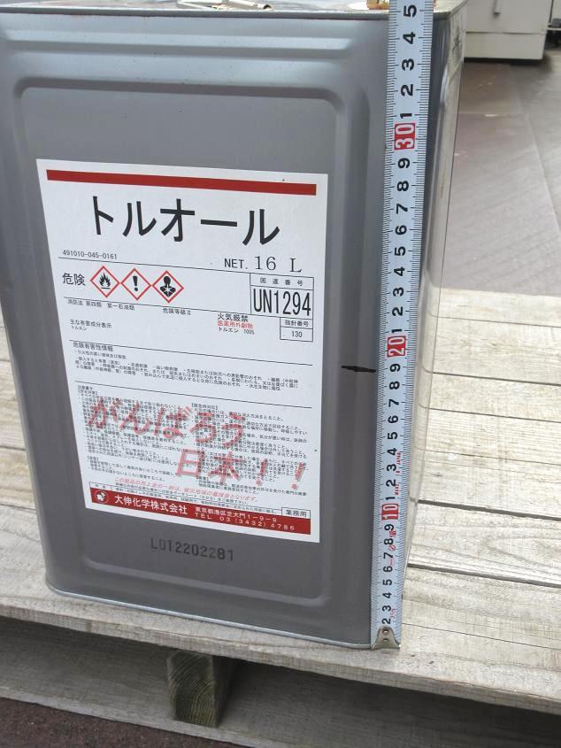 | 商品紹介 | トルオールの16リッター缶です。 トルオール(別名:トロール/トルエン/ メチルベンゼン、フェニルメタン) 片付けで出た物で、雨のかからない屋外に 置かれていました。 使いかけで、残量はラベルの右に引いた 黒い線のあたりまで入っています。 ネットで調べると比重:約0.86、 一斗缶重量:約1.2kgだそうですので (9.9-1.2)÷0.86=約10リットル のようです。 缶に少し錆が出ています。 塗料、希釈剤、溶剤、染料、香料、火薬(TNT) 、有機顔料、合成クレゾール、甘味料、漂白剤、 テレフタル酸、合成繊維、可塑剤などの合成原料、 ベンゼン原料、キシレン原料、石油精製、医薬品、 塗料・インキ溶剤などに使われるようです。 ダンボールで覆い、宅配便の送料元払いにて発送します。 陸便でしか出せない為、離島や沖縄には 発送できない可能性があります。 100サイズとなります。 送料は以下↓↓ |