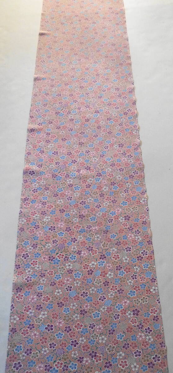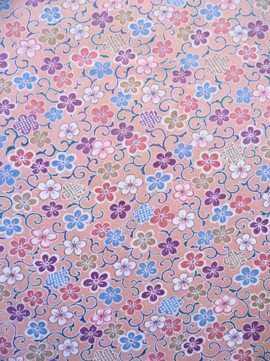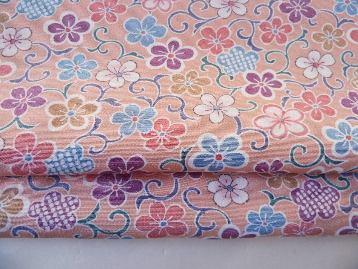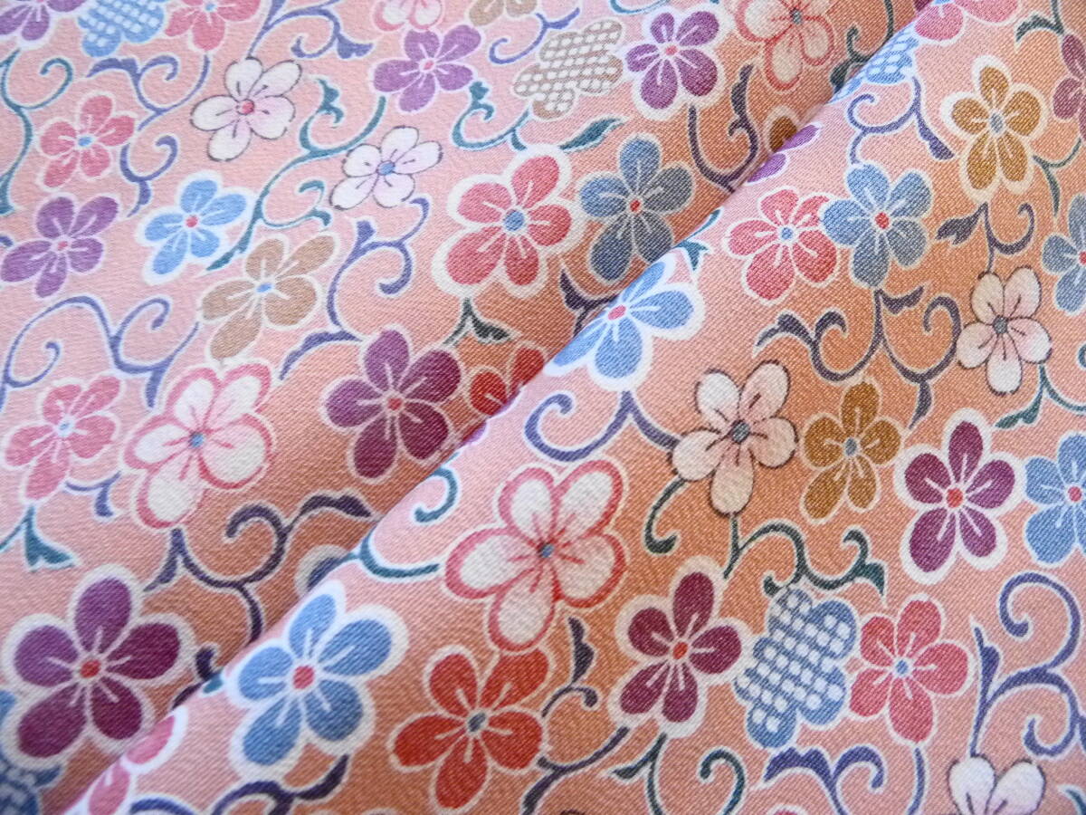 ■彩■古布着物はぎれ/ハギレ 37×160 正絹 縮緬 ポップな花唐草 薄サーモンピンク色 虹色 美品