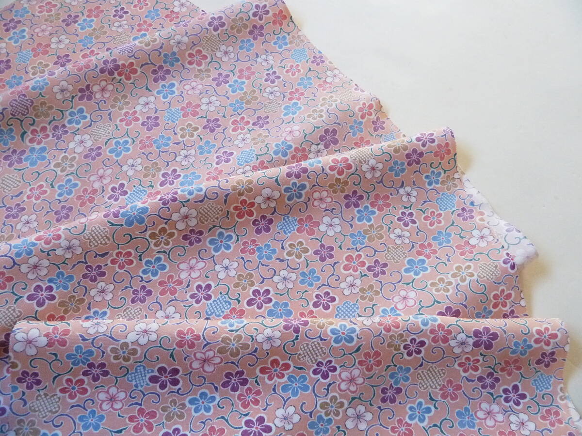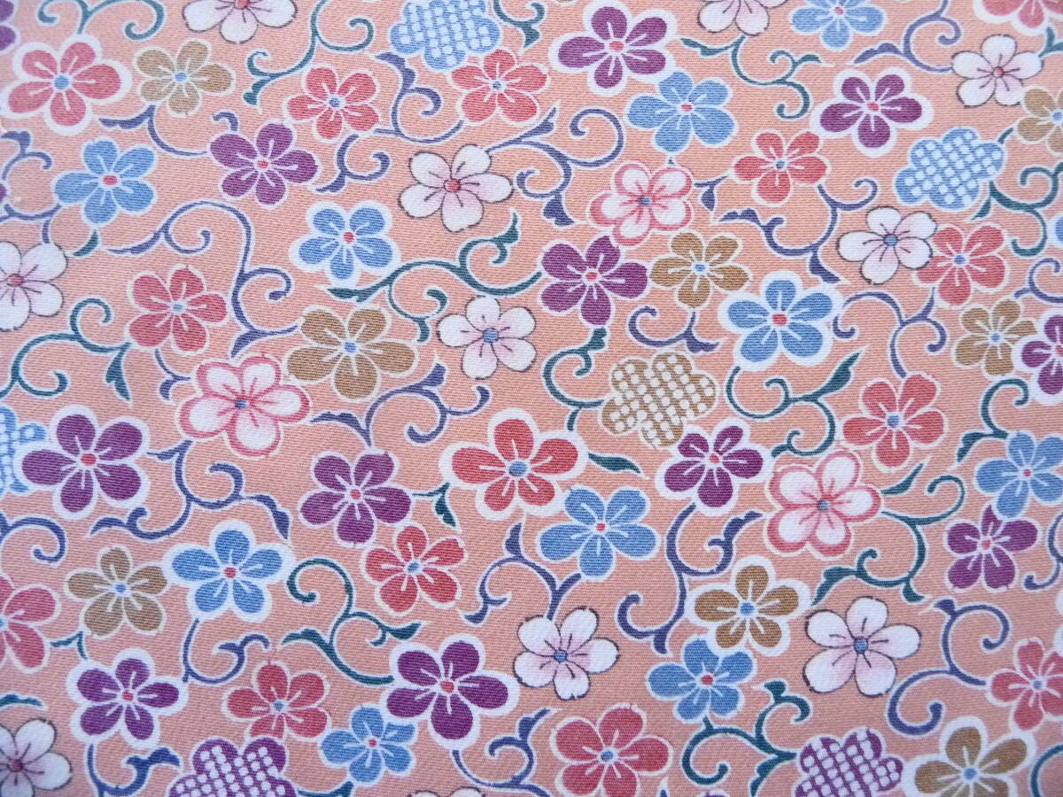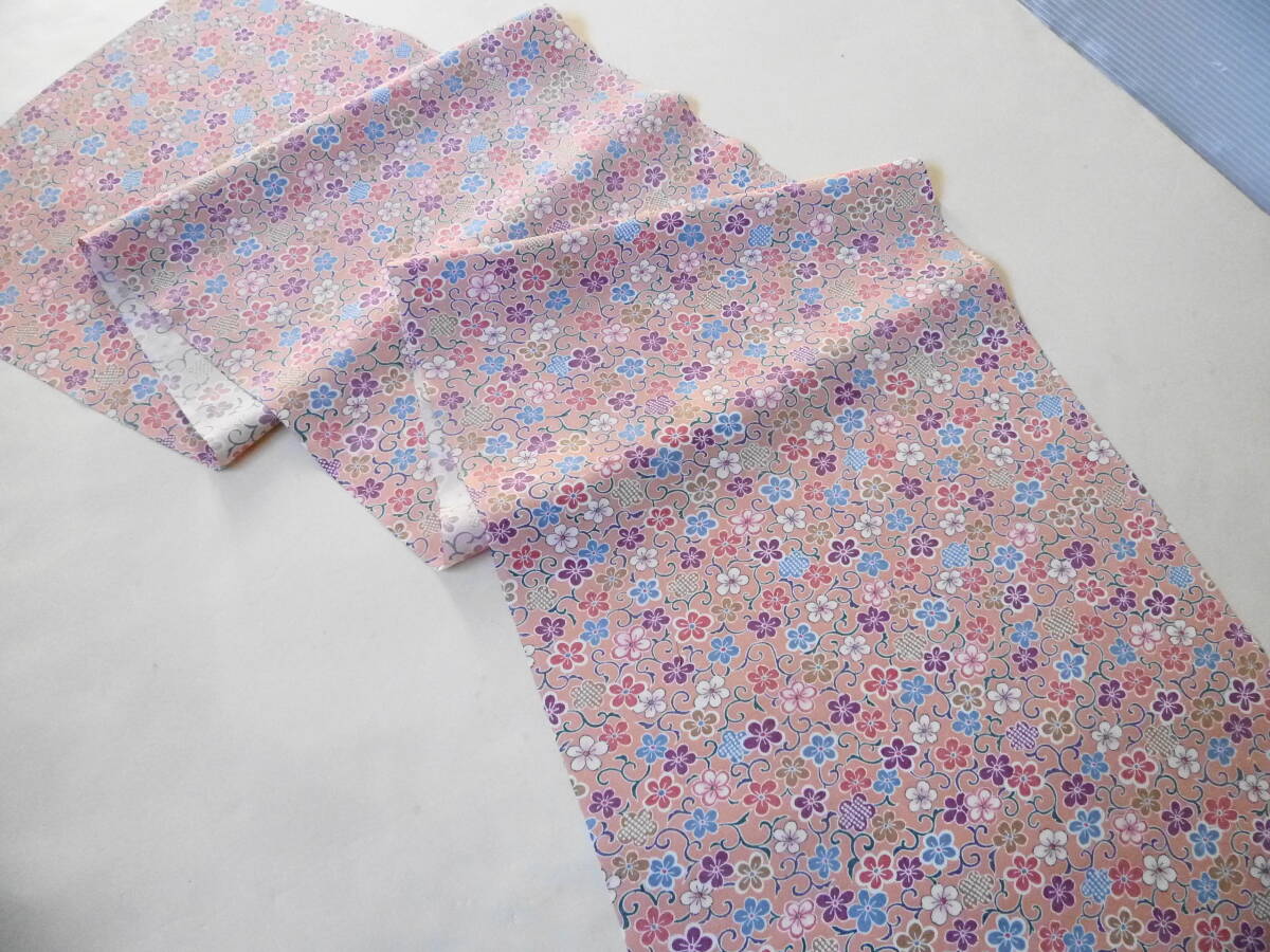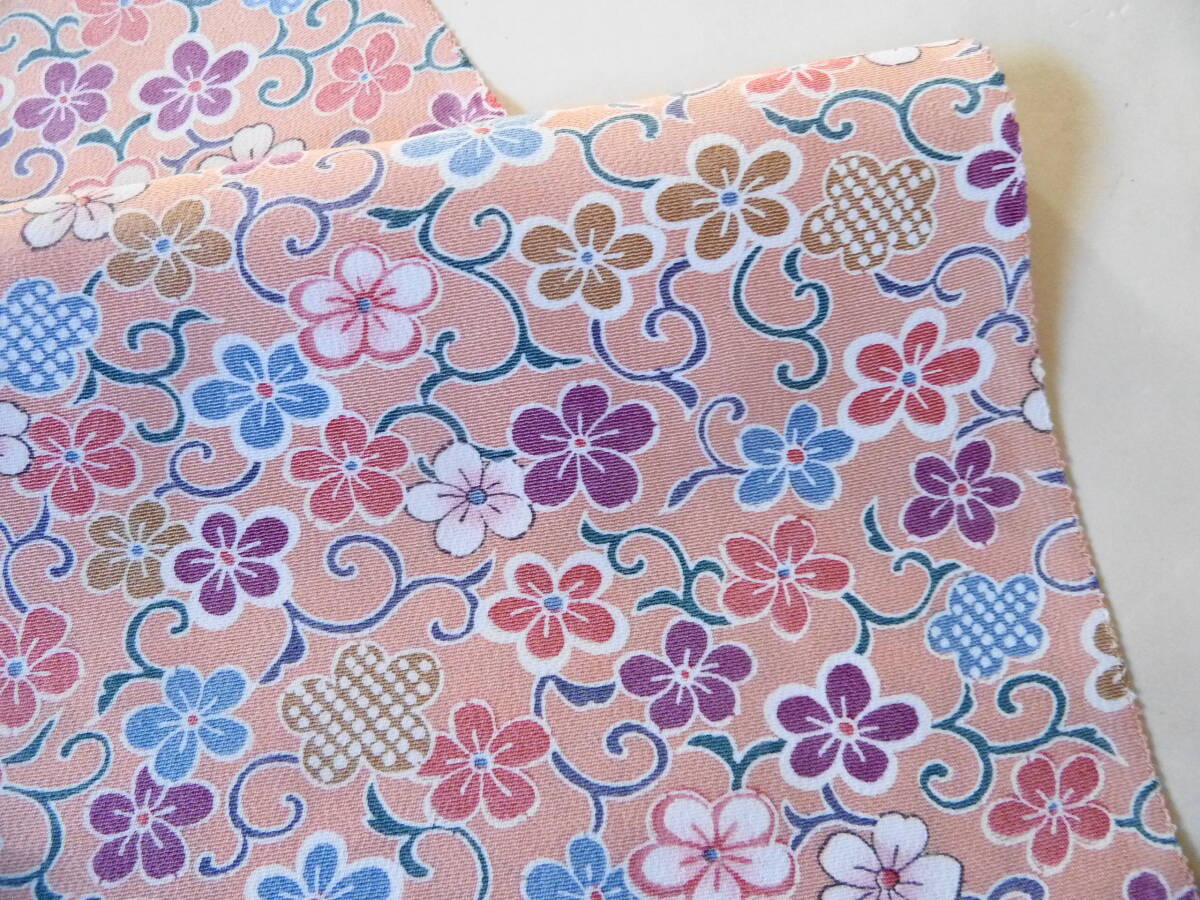 ■彩■古布着物はぎれ/ハギレ 37×160 正絹 縮緬 ポップな花唐草 薄サーモンピンク色 虹色 美品