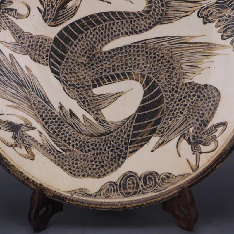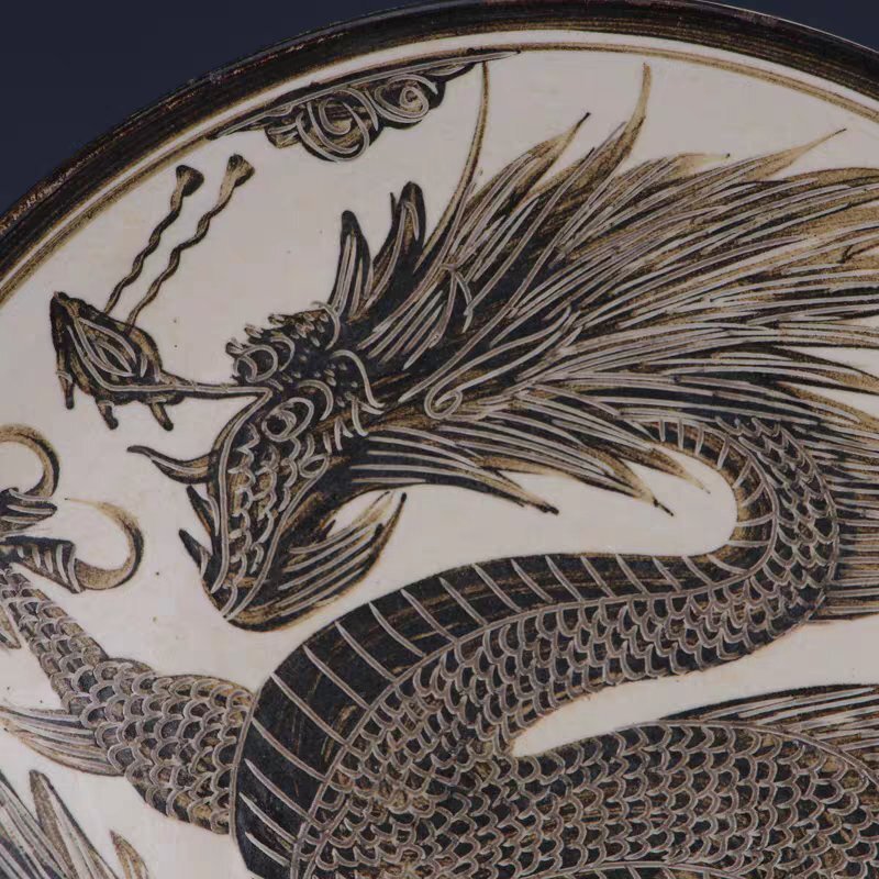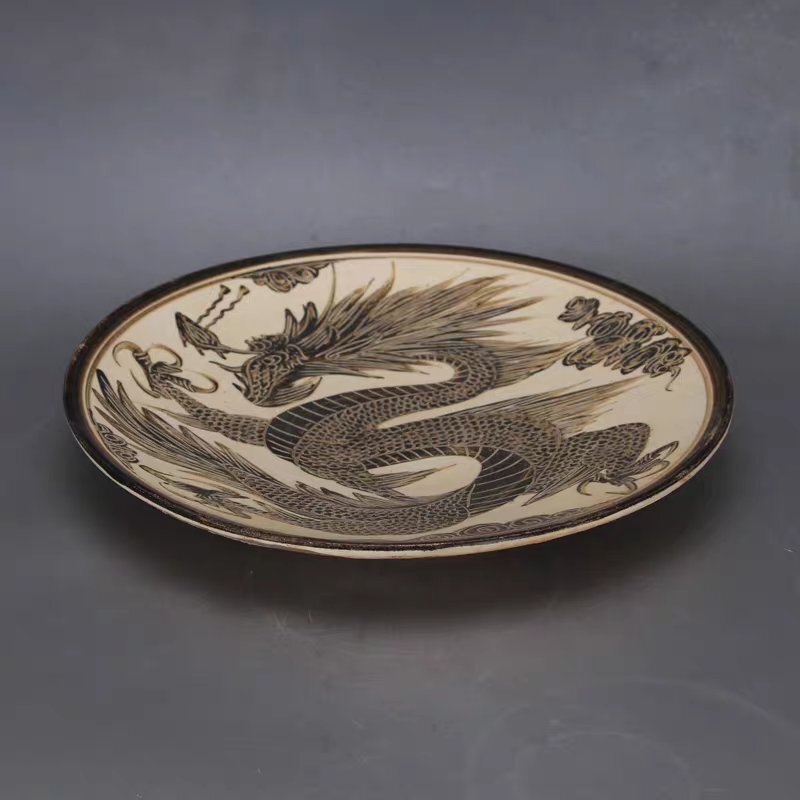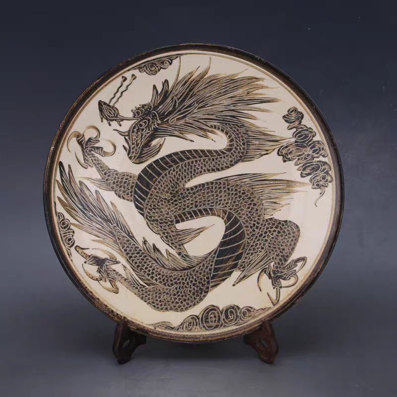 磁州窯 白釉 手描き 龍文様 飾り皿 陶器・景徳鎮 磁器 置物 装飾 収蔵 コレクション