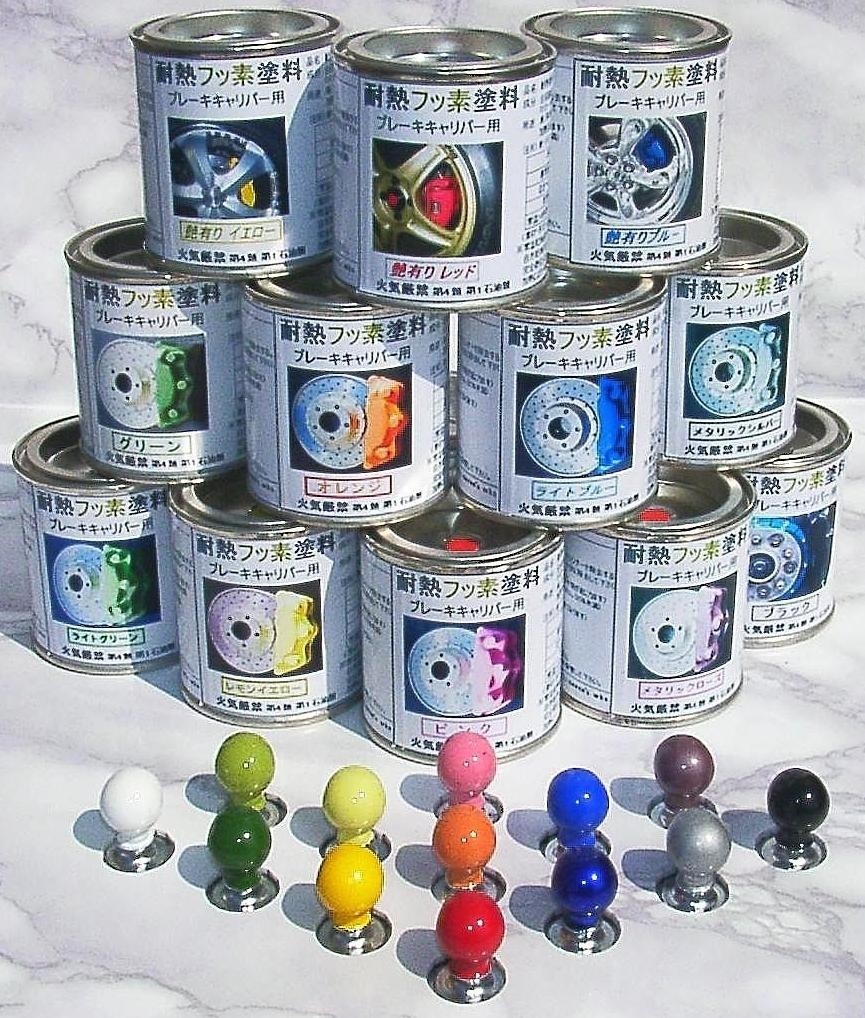 | ☆ キャリパー専用 耐熱塗料 で、お車の足元の オシャレ を! 簡単塗料で ドレスアップ! 隣の車に差をつけましょう! 美しいツヤと、鮮やかな発色で 足元を際立たせ ます! ★ 超簡単仕上! スプレーのように、面倒なマスキングの 手間もいらない! 一般的なスプレーは塗膜が薄く弱く何より艶が足りません。 ※ 市販の塗料は熱で焼けて変色し、やがてボロボロ剥がれます。 また、許容耐熱温度が高い塗料ですと、光沢が減ります。 ◆ 耐熱200℃!密着性抜群!美しい光沢! フッ素含有 のため、焼付け後の変色・色落もなく 耐油性、耐汚染性、耐摩耗性・耐候性に優れ 通常の耐熱塗料に比べ美しい艶のある仕上がりになります。 ※ 当商品は冷却・抑振・制動性効果等は検証/測定されてません。 ◇ サビ止剤は含まれていませんが ローターの中心 や エッジ部 など サビ易い箇所の保護 & ドレスアップ に! シリンダーヘッドカバーも OK!その他 エンジンルーム内に! ※ エンジンブロック・エキゾースト・マフラーは不可! バイクのエンジンブロックには対応できます! ● カラーバリエーション 【落札後、取引ナビでご指定下さい】 ☆艶有りレッド ☆艶有りオレンジ ☆艶有りピンク ☆艶有りブルー(濃紺) ☆艶有りライトブルー ☆艶有りイエロー(濃黄) ☆艶有りレモンイエロー ☆艶有りグリーン(濃緑) ☆艶有りライトグリーン(草色) ☆艶有りホワイト ☆艶有りブラック ☆艶有りメタリックシルバー ☆艶有りメタリックローズ ※ クリアーを足して艶光UPを強調する他社商品や、 シンナーで希釈して増量を謳う他商品に気を付けて下さい。 ◆ 1缶で普通車のキャリパー4枚を2回以上薄く重ね塗り可能。 1缶(80g)の標準塗装面積0.5~0.75㎡を参考にご検討下さい。 ※ 高性能ビッグキャリパー車には、2缶必要な場合があります。 | ||