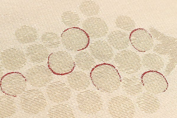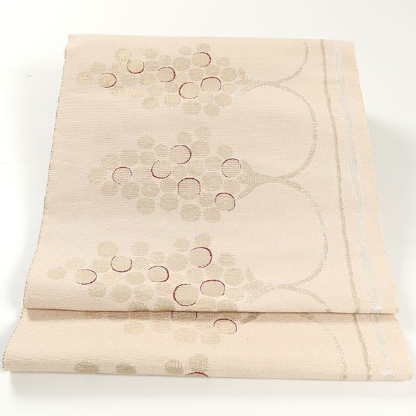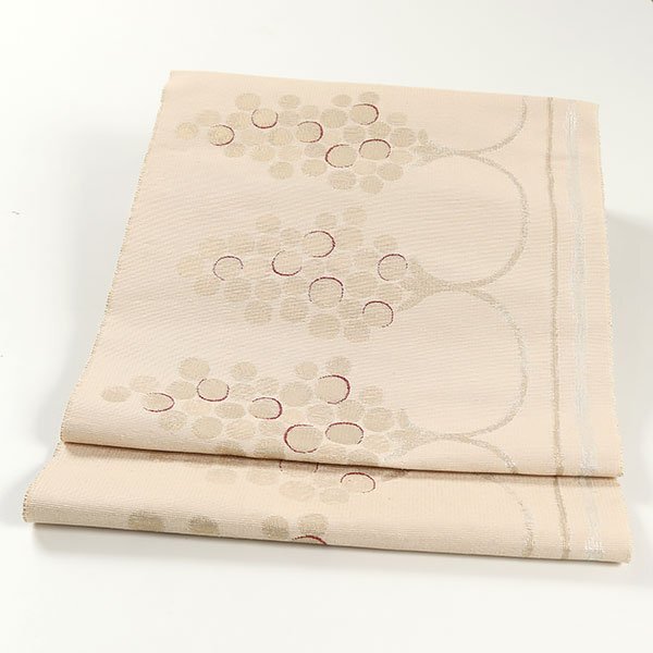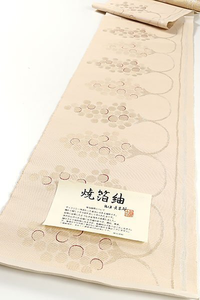少しざっくりとした風合いのある焼箔紬の帯地は、薄ベージュ色の紬地でございます。うっすらと金が透けて見え、重厚感のある帯地でございます。