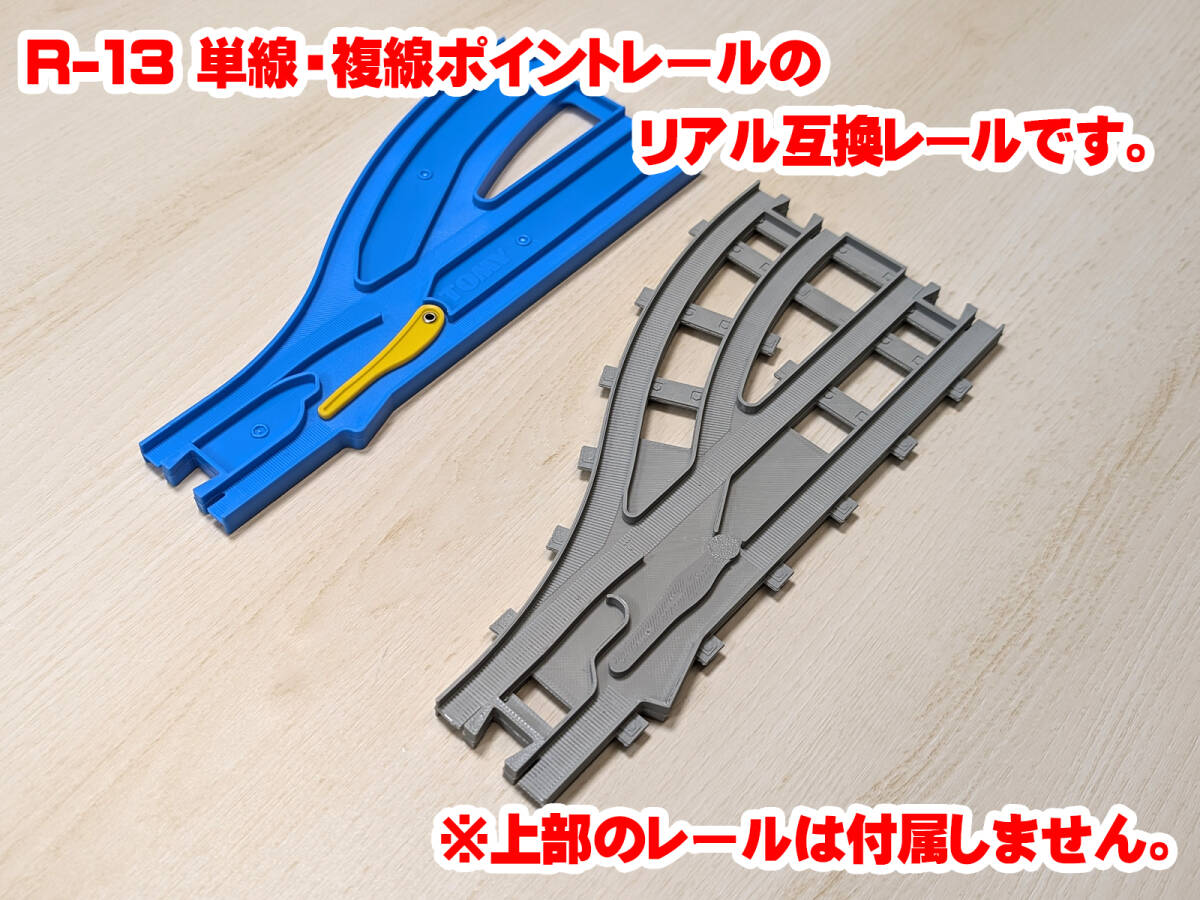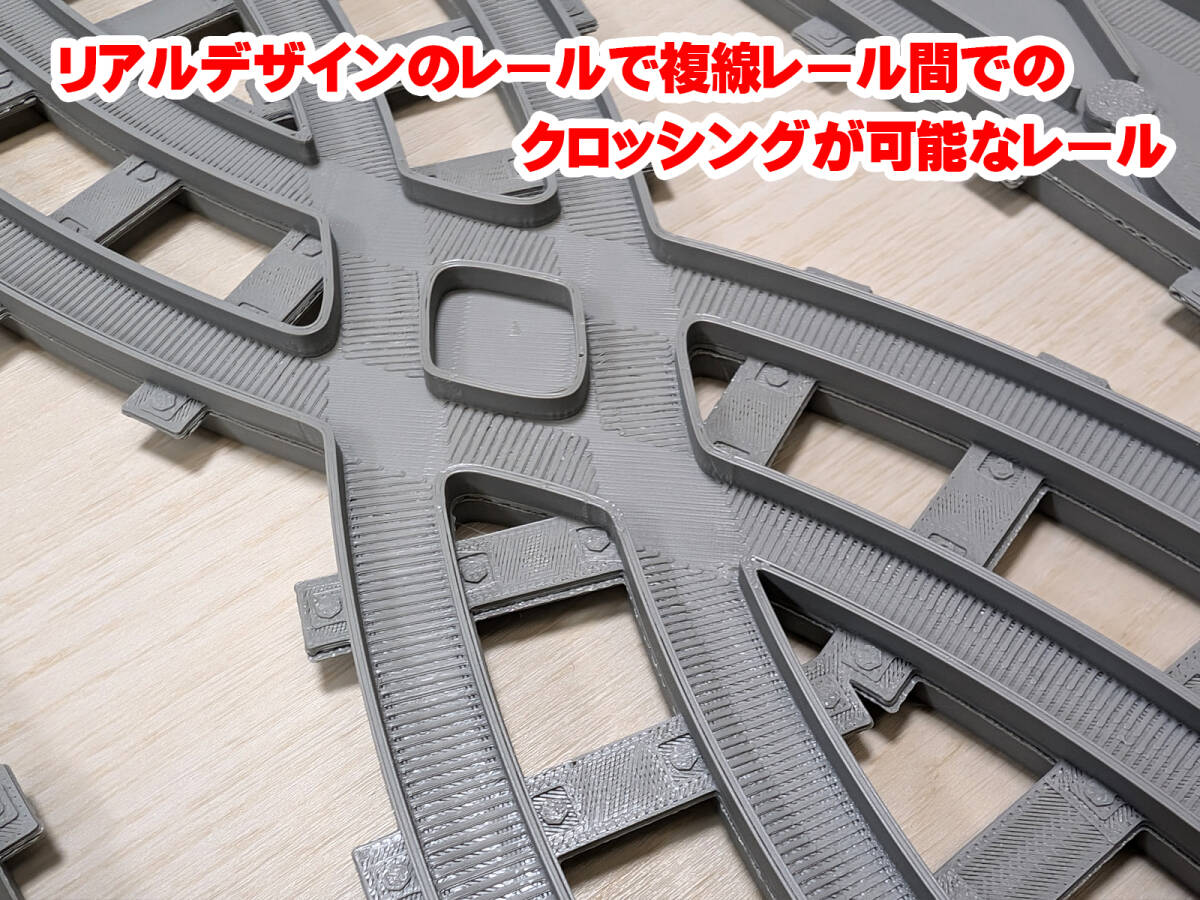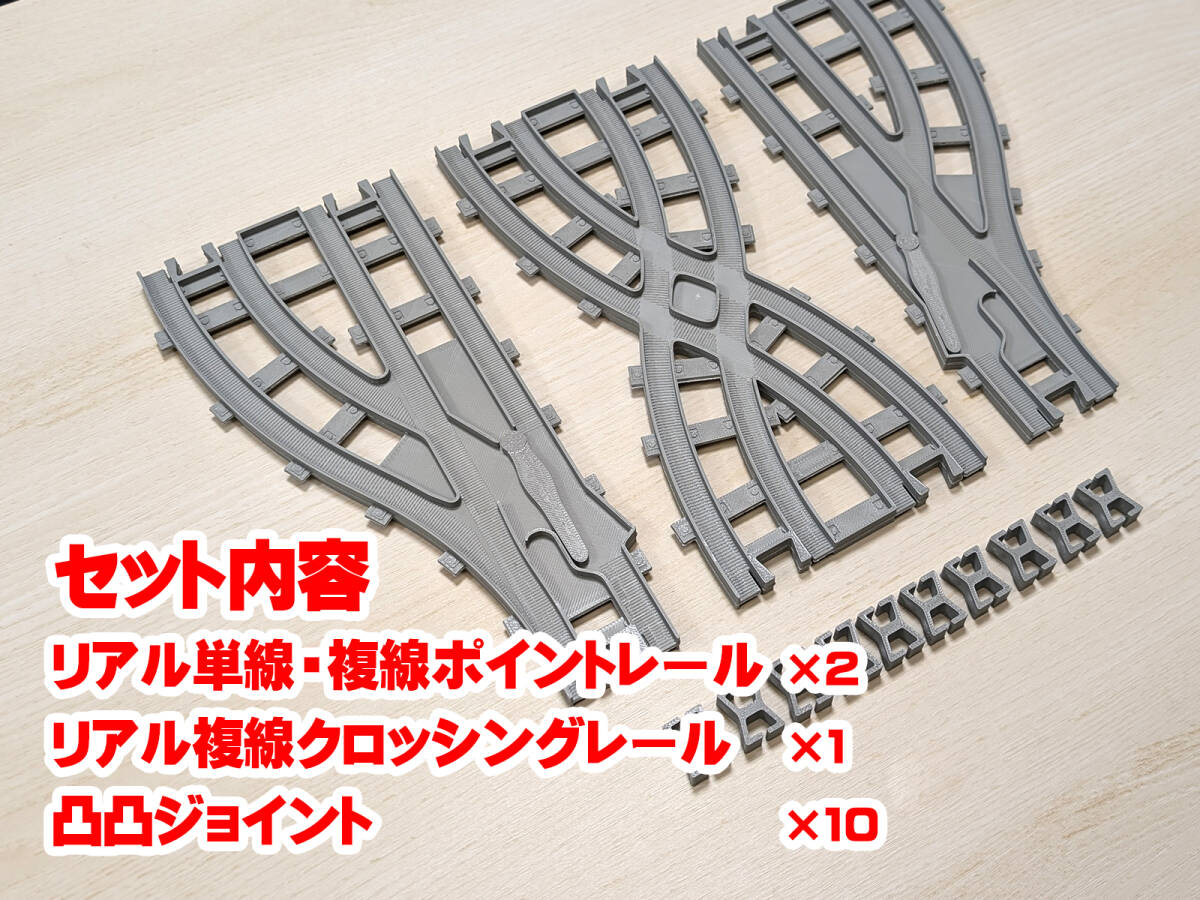 単線と複線を切り替えるためのポイントレール(R-13のリアルレール風互換)と、複線幅のレールで入れ替えが可能なクロッシングレールのセットです。