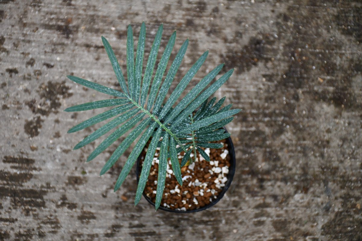 ディオーン・カリファノイはメキシコ原産のソテツで、葉は青緑色となり、きれいなものです。サイズは3.5号ポット、高さ22センチ、ワイド13センチです。Dioon califanoi この商品は80サイズです。★★★★★★お知らせ★★★★★★