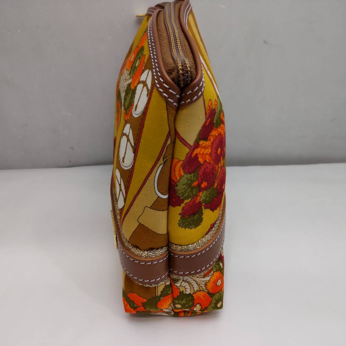 カラーはブラウン×イエロー系統のマルチカラーです。 幅約31cm 高さ約20cm マチ約7cm わずかなスレキズ汚れ、金属部分の変色・くもりなどが少々見られます。 内側には糸ほつれが2箇所見られました。画像8 専用の紙箱に入っていますが、書き込みや破れなどが見られます。 | ||||