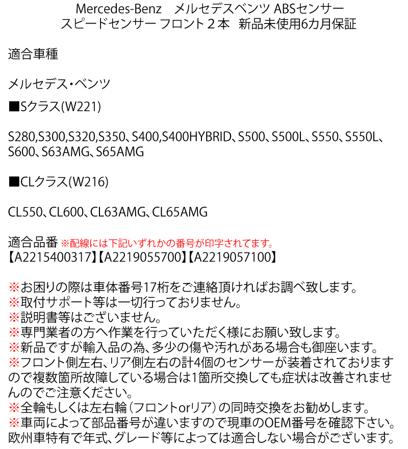 商品名 ベンツ W221 W216 Sクラス CLクラス ABSセンサー スピードセンサー 車速センサー フロント 左右セット A2215400317 A2219055700 A2219057100