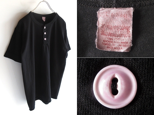 ヘルスニットの定番ヘンリーネックTシャツ。80年代辺りのビンテージタグが付いたデッドストックのボディーに後染めを施しております。3つボタンのヘンリーネックが特徴的。ジャケットやシャツのインナー使いにもお薦めのアイテムです。